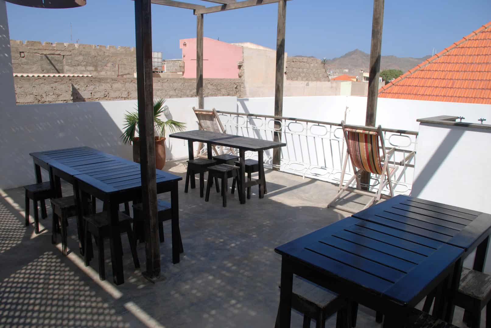 There is an inner courtyard with plunge pool, seats to relax in, sun umbrellas for shade and a variety of plants to add to the calm ambience. There’s a delightful roof terrace with great views of Mindelo and it turns into a charming venue for an early evening drink.