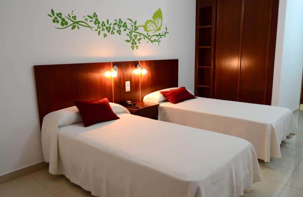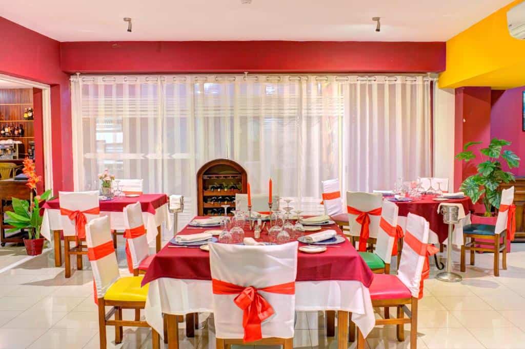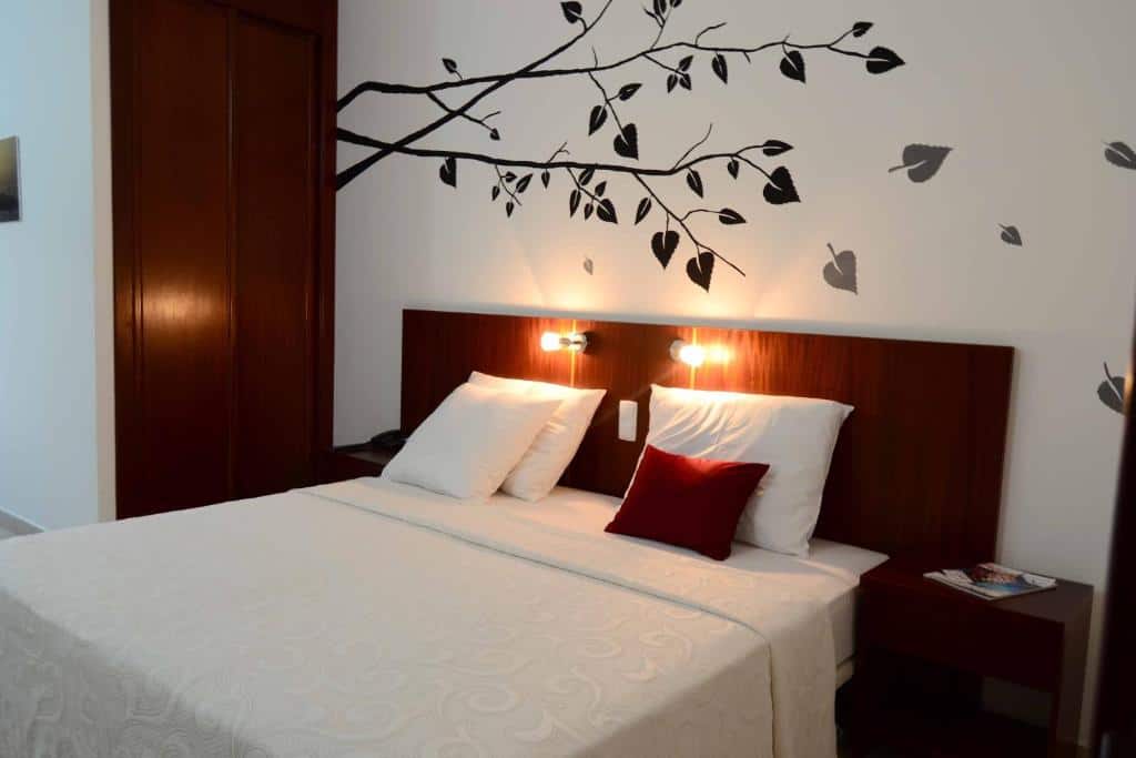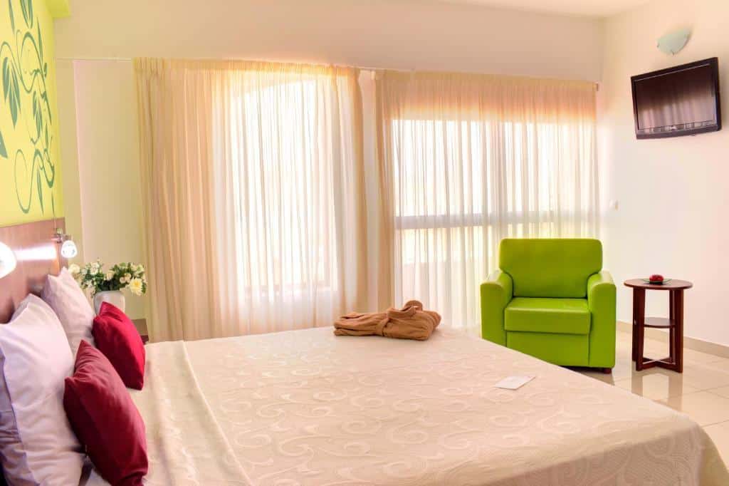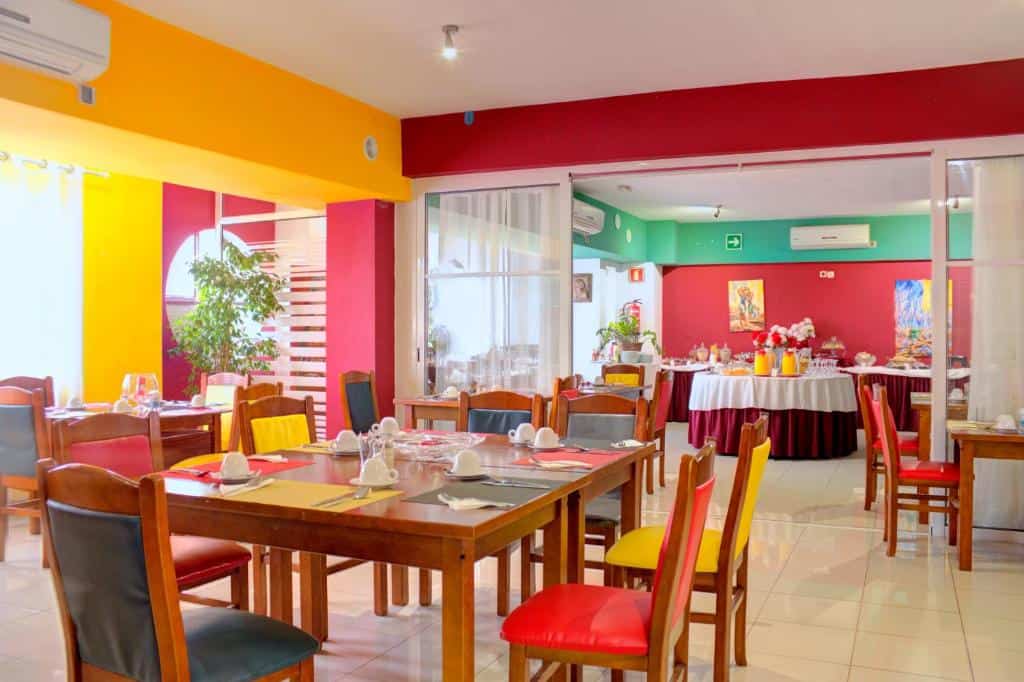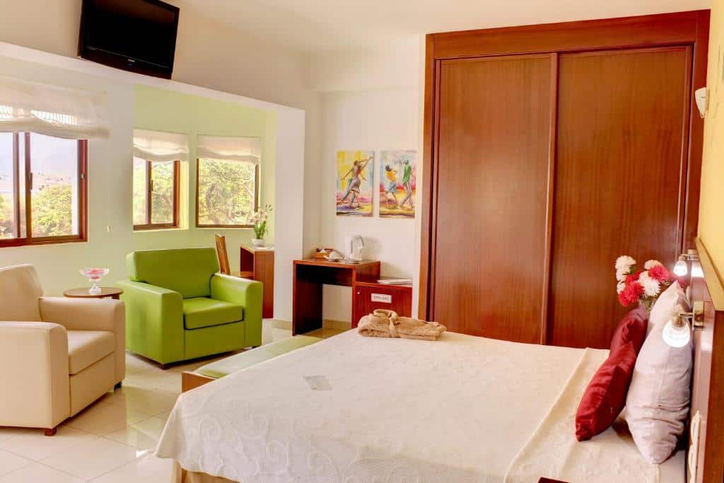 The forty-four rooms are air-conditioned, comfortable and bright. Room facilities include a TV and minibar. The standard rooms have a side-sea view and there are also suites which have a balcony and full view to the bay. The on site restaurant has views across Parque Nhô Roque, a small city park on the ocean front.