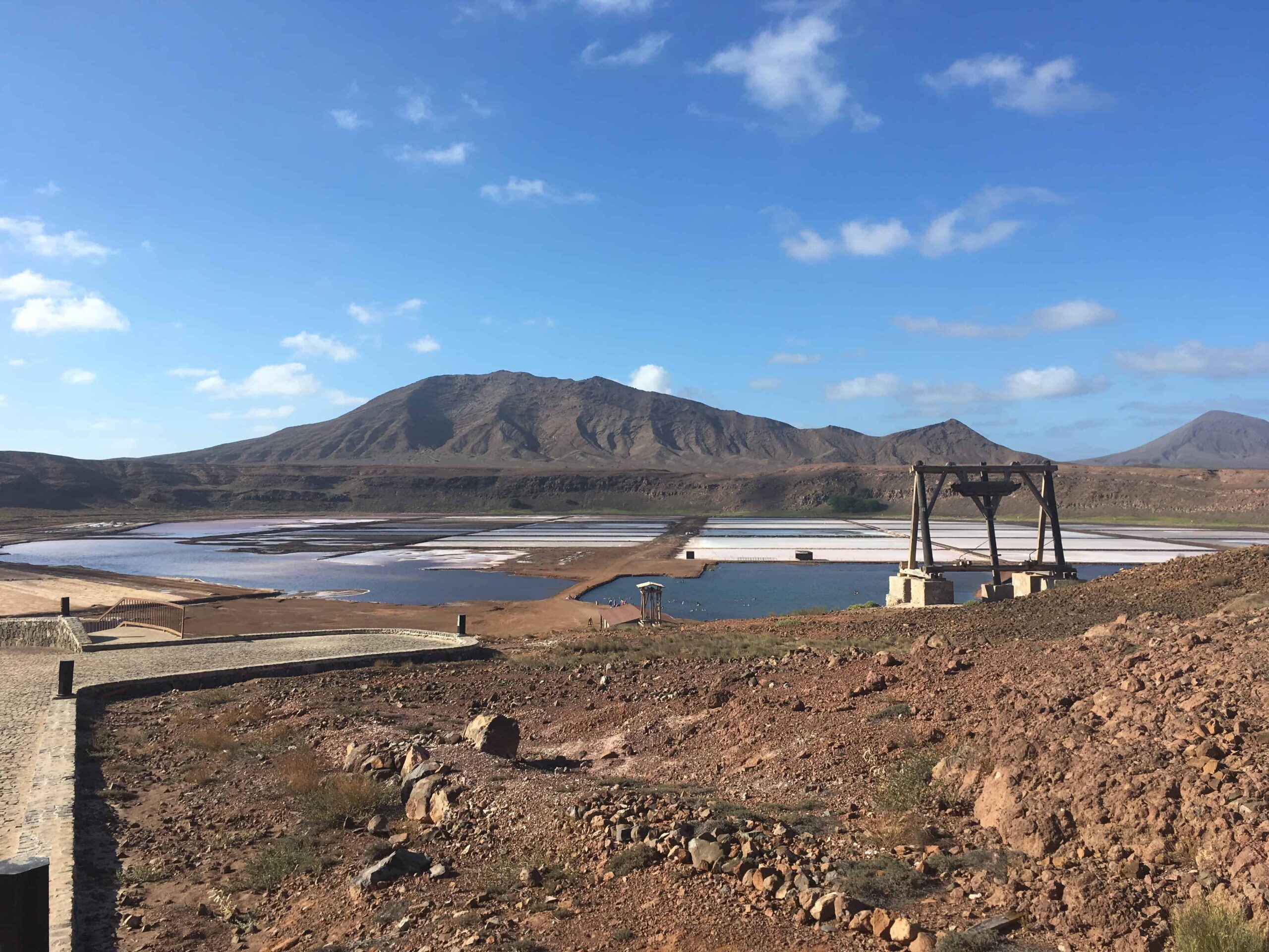 We drove from Santa Maria to the salt beds at Pedra de Lume, passing Kite Beach marked by a horizon-full of fast moving kites of the surfers. Walking from the entrance tunnel, the crater floor of Pedra de Lume is revealed – a vast, flat expanse with salt water swimming pools and white salt beds.
