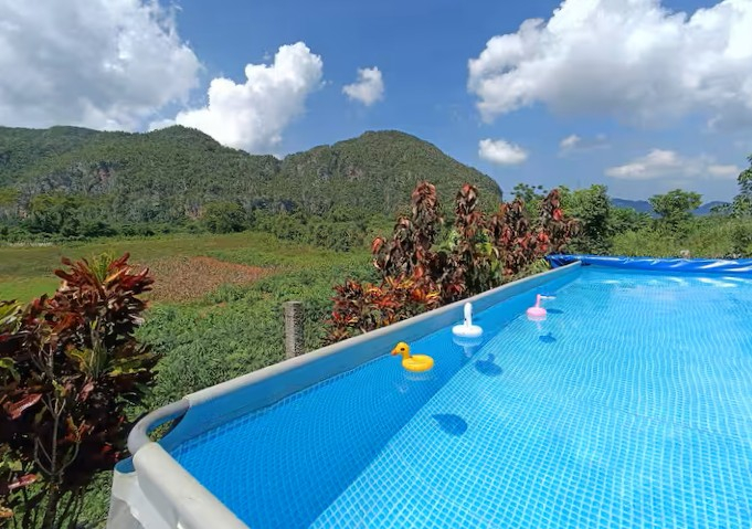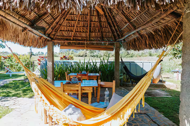 All guests staying here are looked after by a small local team, who are just so lovely and welcoming. They prepare breakfast each day and you can request dinner and drinks. There is also a communal garden and thatched dining area, and a semi-permanent swimming pool shared by the guests. From the villa, its an easy 10 minute stroll along a quiet road to get into the town of Vinales.
