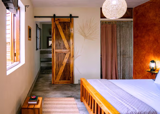 Platano Suite (Sleeps 2): This open-plan room has a queenside bed and modern shower, and a wide door leading outside. The patio area has a small table and chairs, and a hammock.