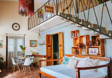 Premium Almendra Suite (Sleeps 4): The downstairs floor is open-plan and has a double sofa bed, a small dining area, and a beautiful kitchen with an incredible view from the window. Adjoining this room is a fabulous shared bathroom. A set of stairs leads up to a mezzanine floor, which has a king-sized bed and a little seating area.
