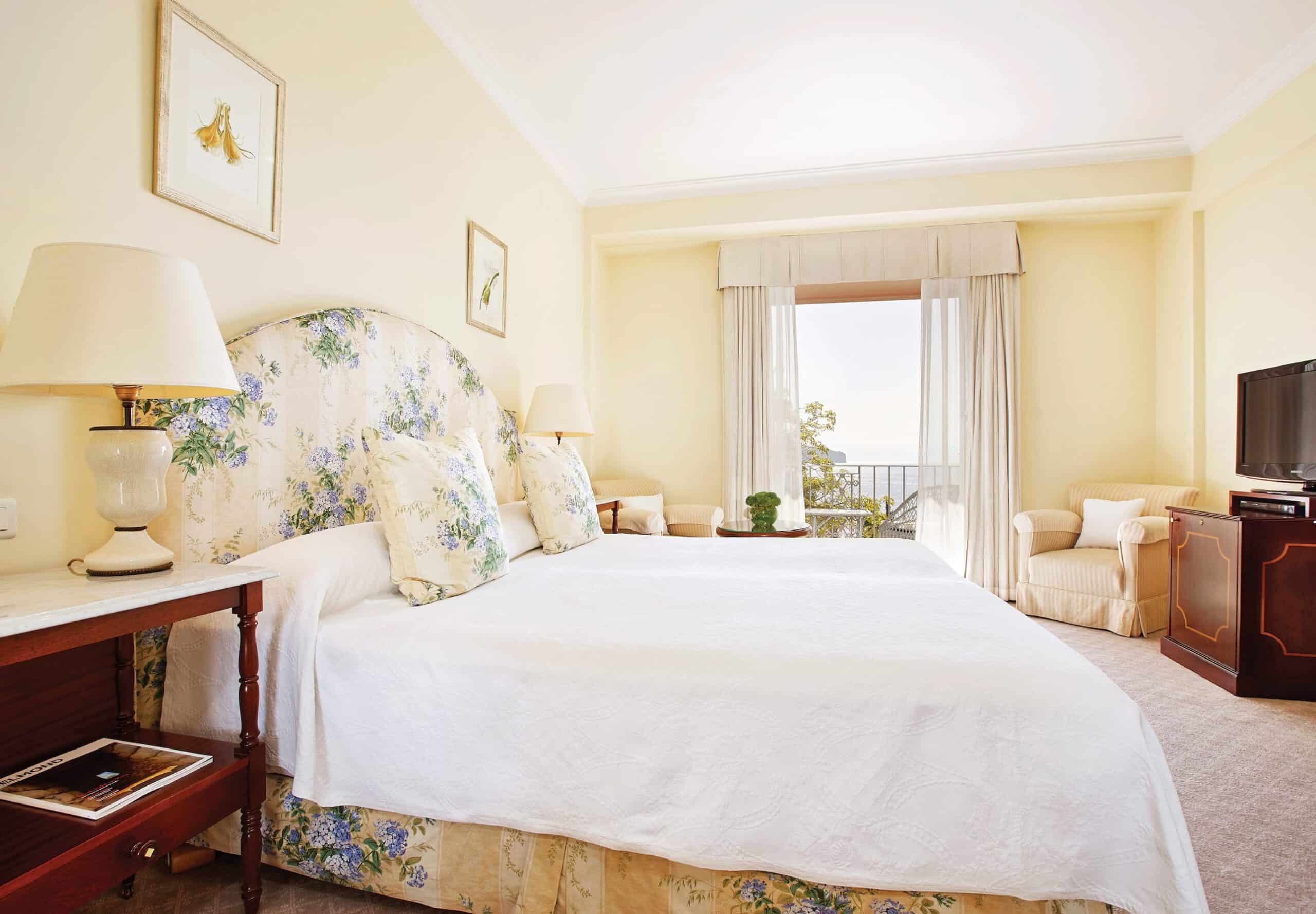 There’s also a modern fitness centre with a tennis court, extensive spa facilities and three swimming pools: one heated pool and two seawater pools, with a private terrace leading directly down to the ocean. The rooms themselves are a mix of comfortable modern decor with antique flourishes; bright and spacious, with floor-to-ceiling windows and ocean view balconies.