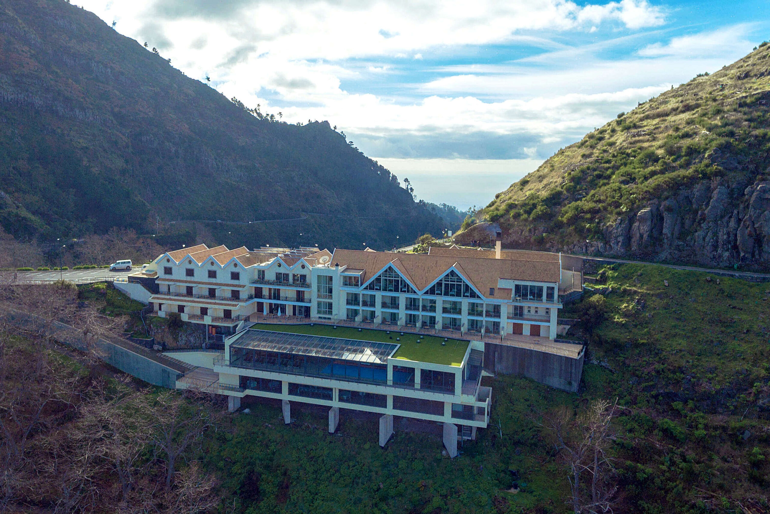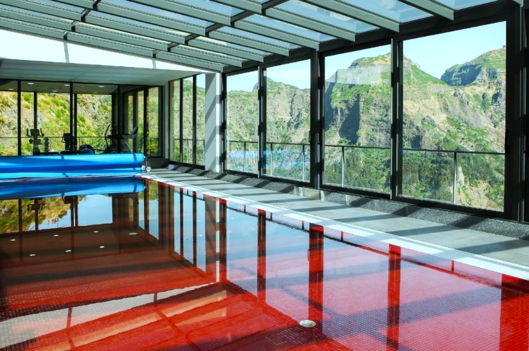 The Eira do Serrado Hotel sits on the summit of Pico do Serrado and towers over the village of Curral das Freiras. The hotel overlooks the nuns valley, one of Madeira’s most photographed views. Guests staying at the hotel can enjoy this view from each of the hotel’s twenty-six spacious balcony rooms. You also get this same beautiful vista from the glass-covered heated swimming pool, the fitness room, and the restaurant terrace.