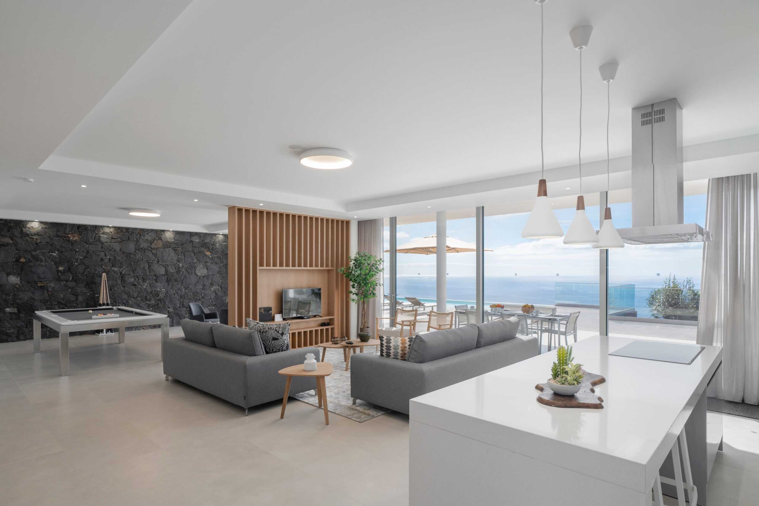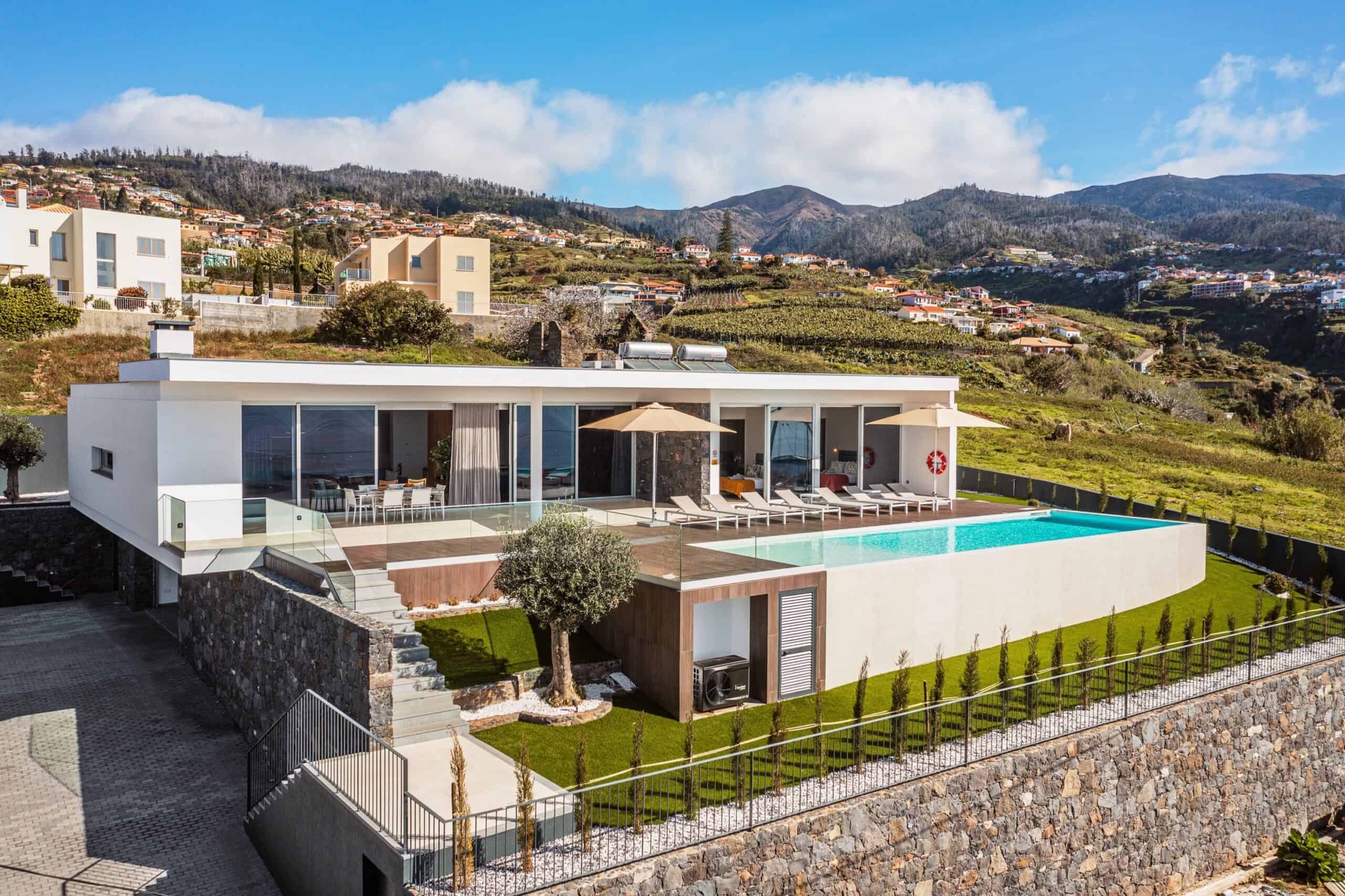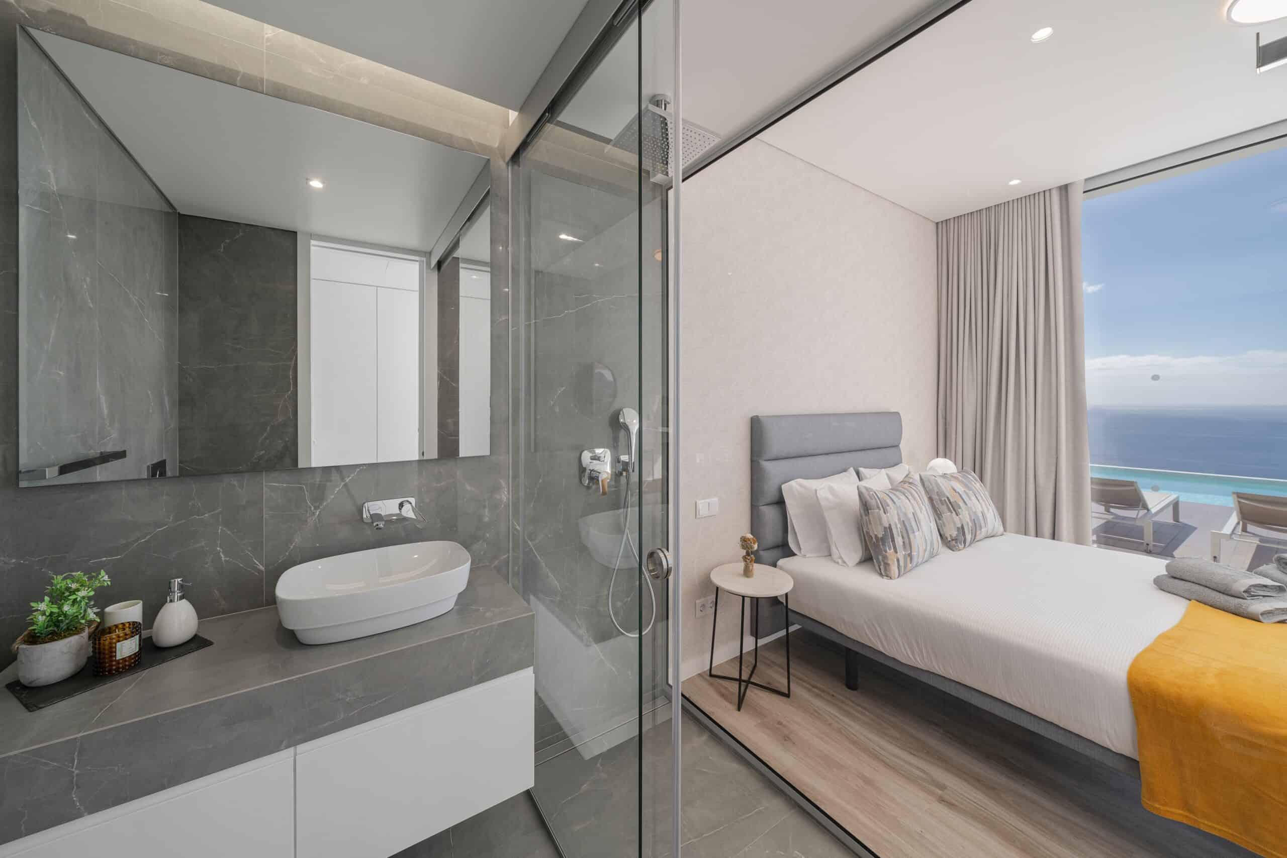 This ultra-modern villa is located in the tranquil parish of Estreito da Calheta on Madeira’s sunny south coast. Floor to ceiling picture windows help bring the outside in, connecting the large open-plan living area and well-equipped kitchen with the spacious sun terrace, outdoor infinity pool and south facing garden. There are four ensuite bedrooms, two doubles and two twins, and the double rooms have direct access to the sun terrace and pool.