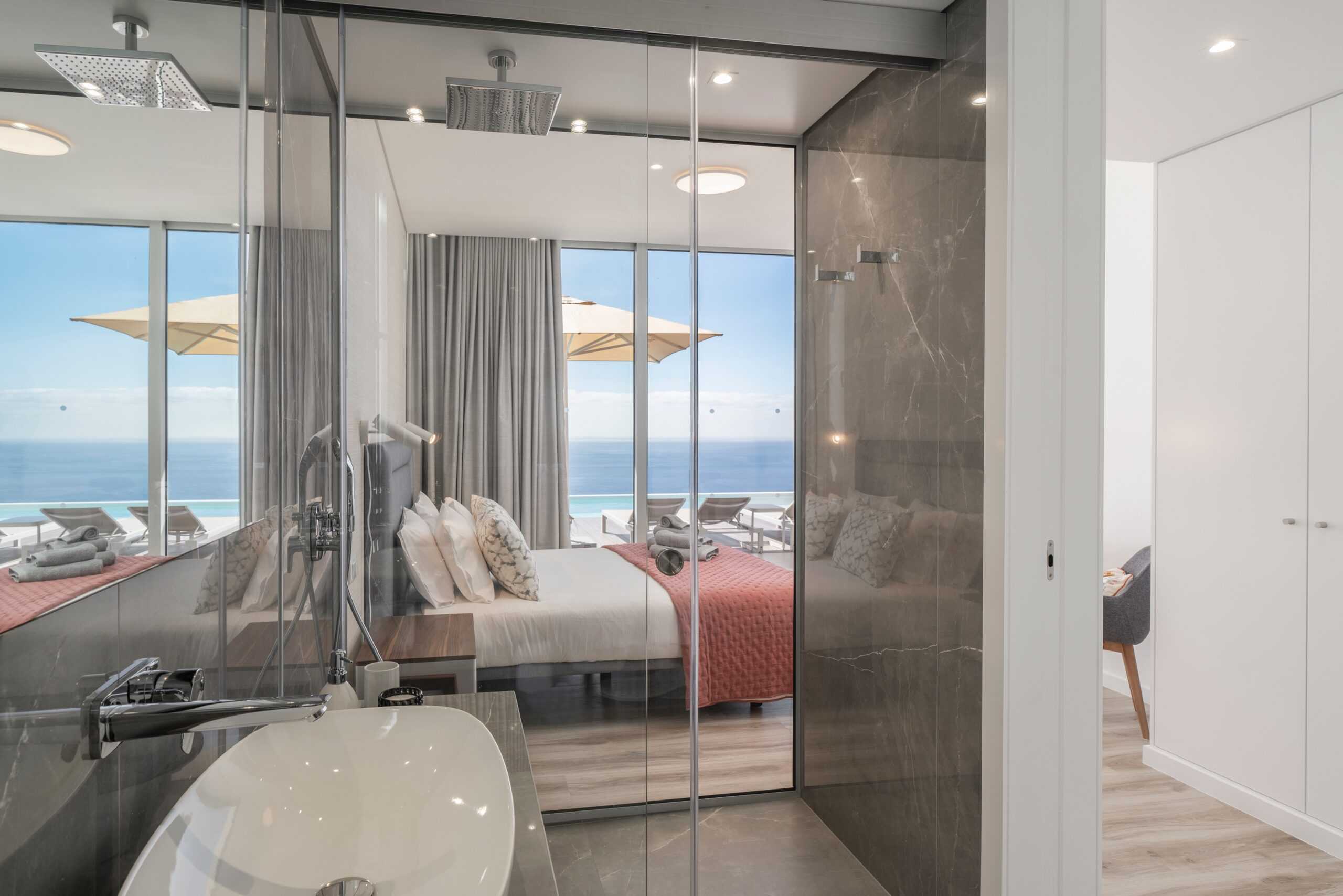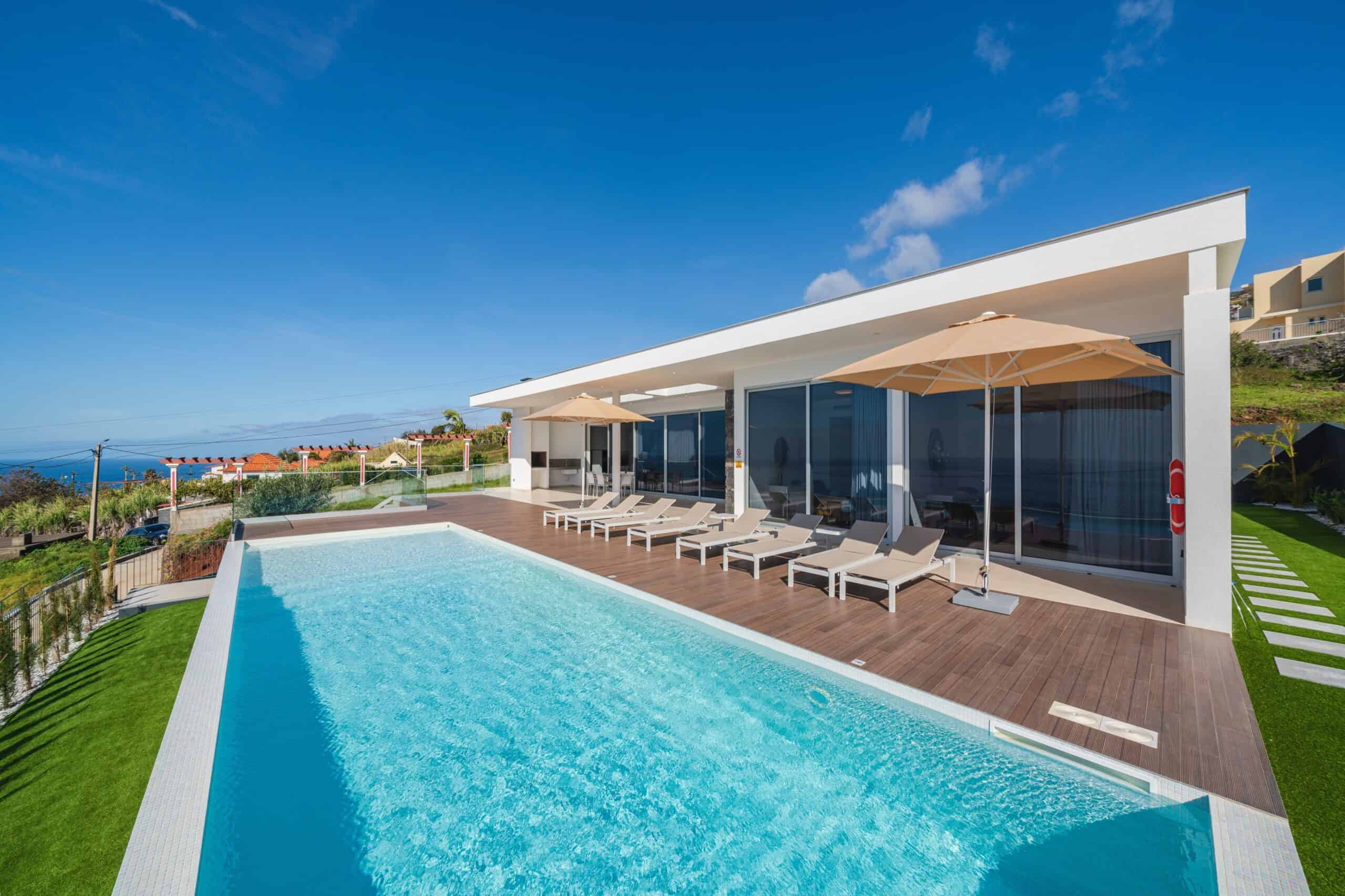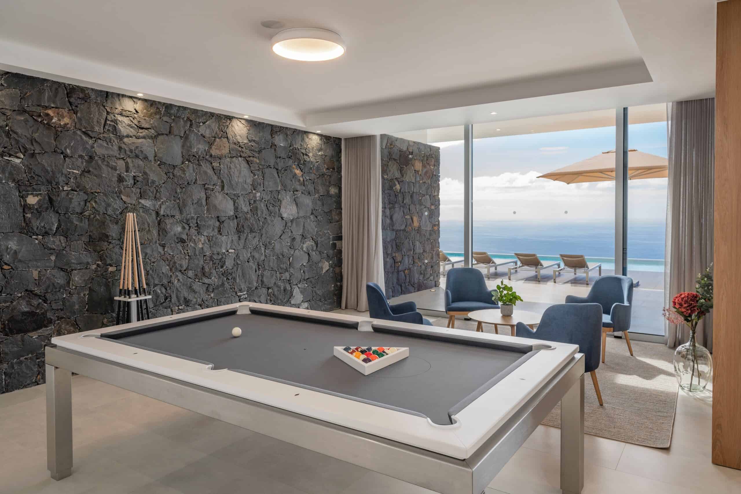 This ultra-modern villa is located in the tranquil parish of Estreito da Calheta on Madeira’s sunny south coast. Floor to ceiling picture windows help bring the outside in, connecting the large open-plan living area and well-equipped kitchen with the spacious sun terrace, outdoor infinity pool and south facing garden. There are four ensuite bedrooms, two doubles and two twins, and the double rooms have direct access to the sun terrace and pool.