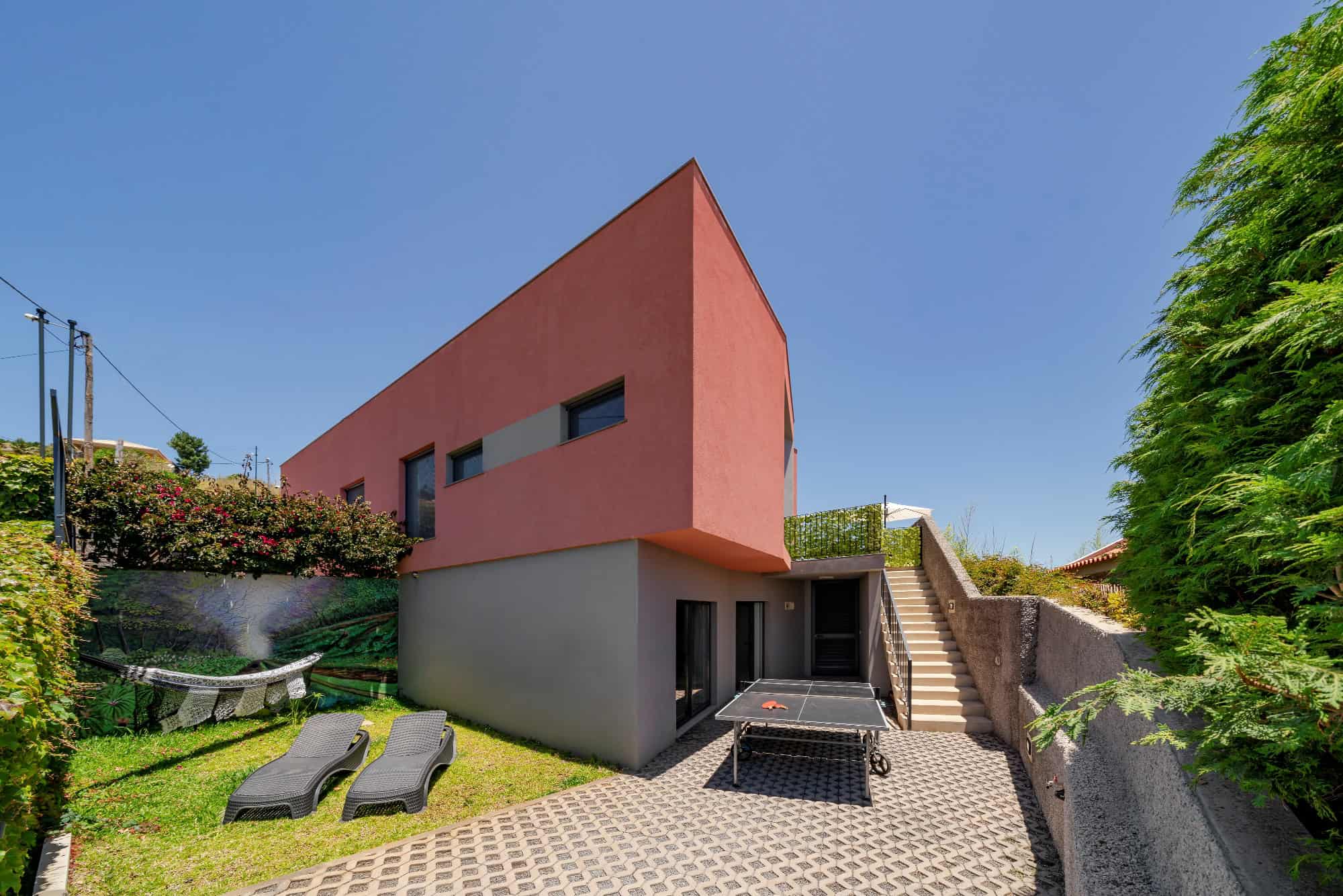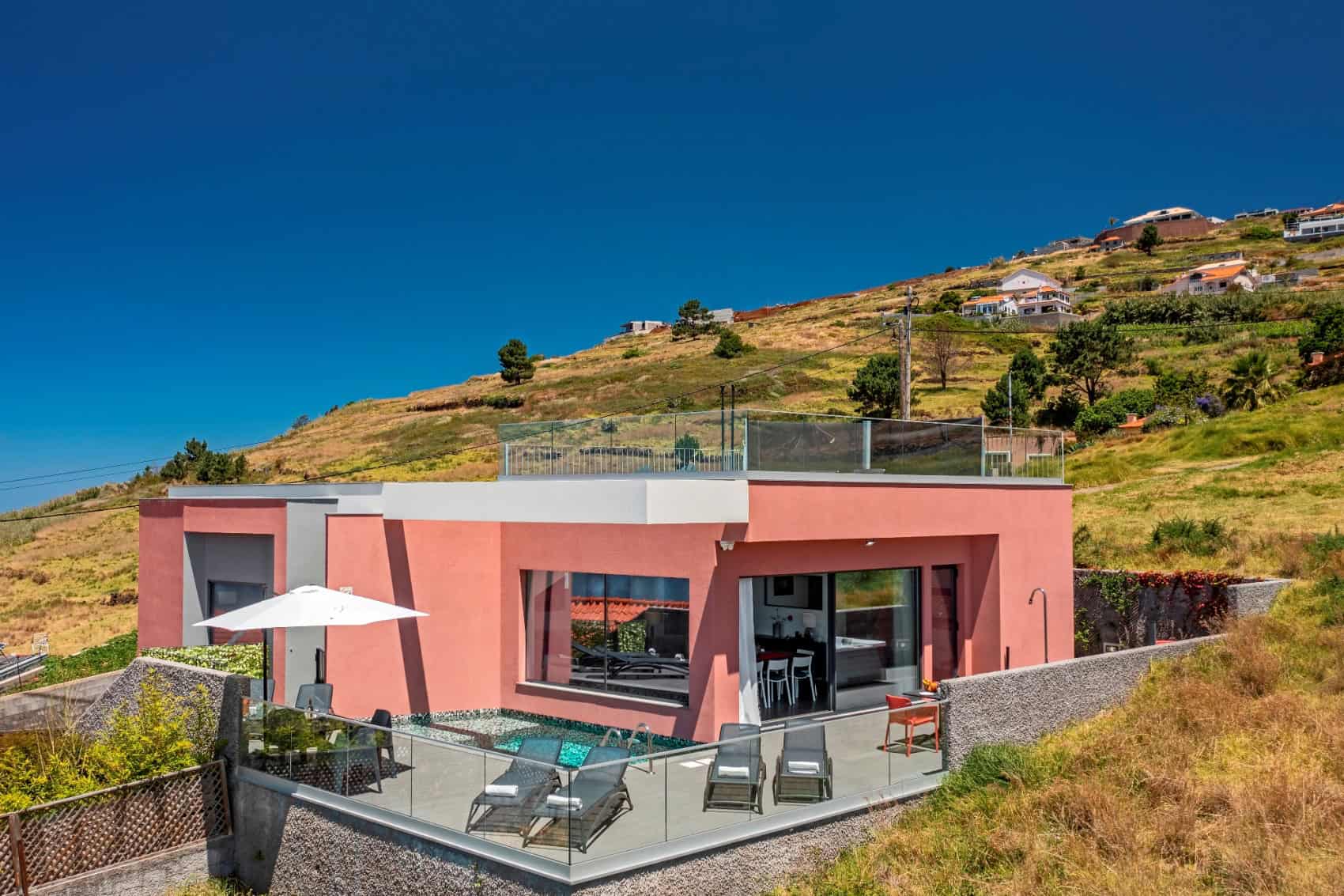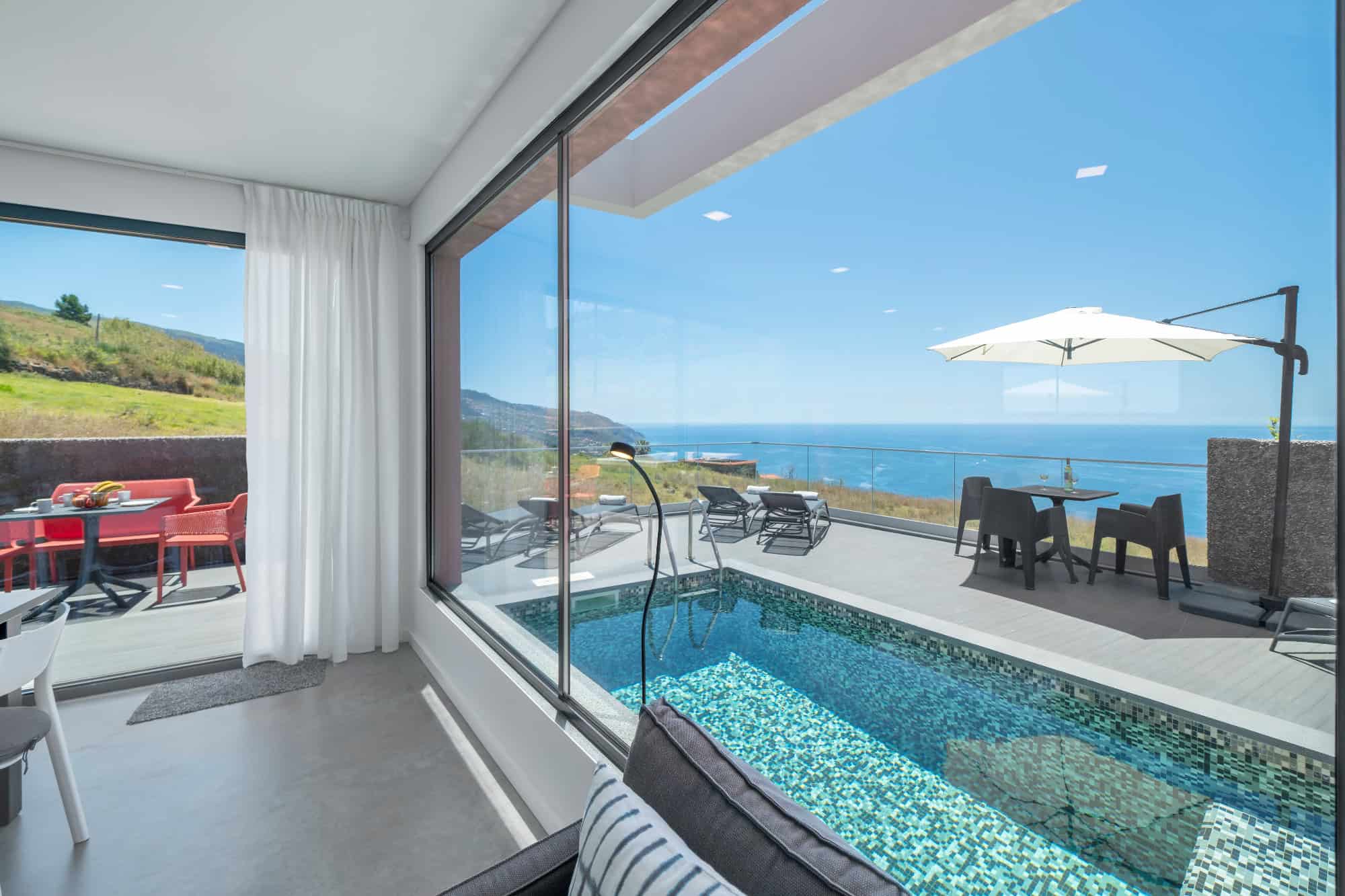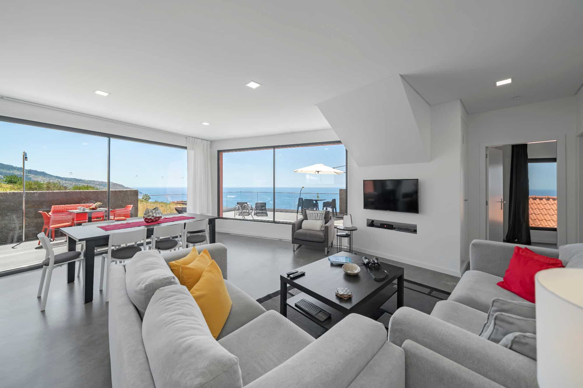 This detached, new-build villa is in the remote parish of Prazeres and has an unbroken sweeping view out across the Atlantic ocean. The open-plan living room/kitchen/diner area is on the ground floor and opens out onto a south-facing sun terrace and outdoor pool. There’s also a second, roof-top sun terrace, where you can relax in the evenings to enjoy the south coast famous sunsets. There are four bedrooms in total, two doubles and two twins, all on the ground floor. Heading downstairs, there’s also a lower ground floor with a games room and a small gym.
