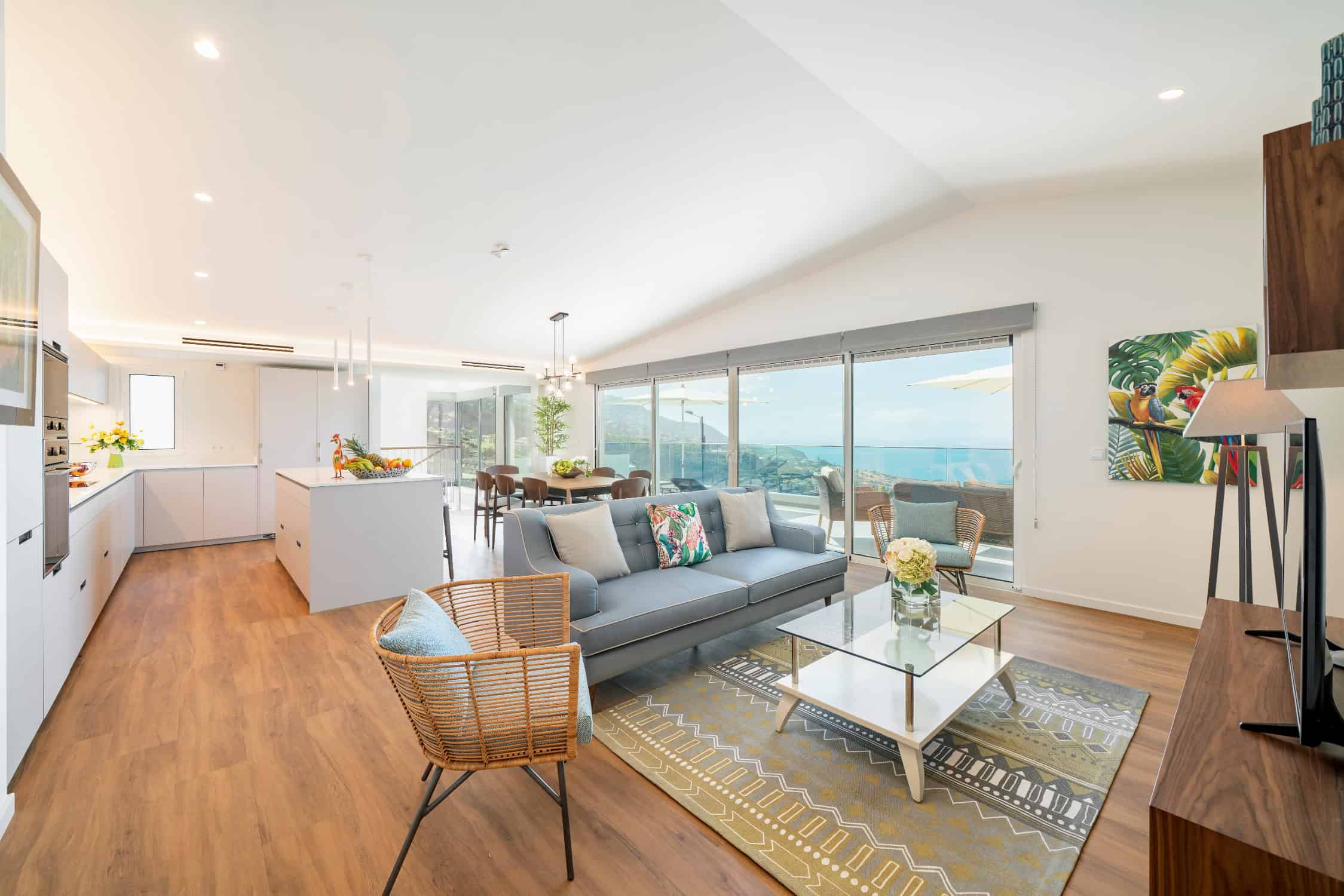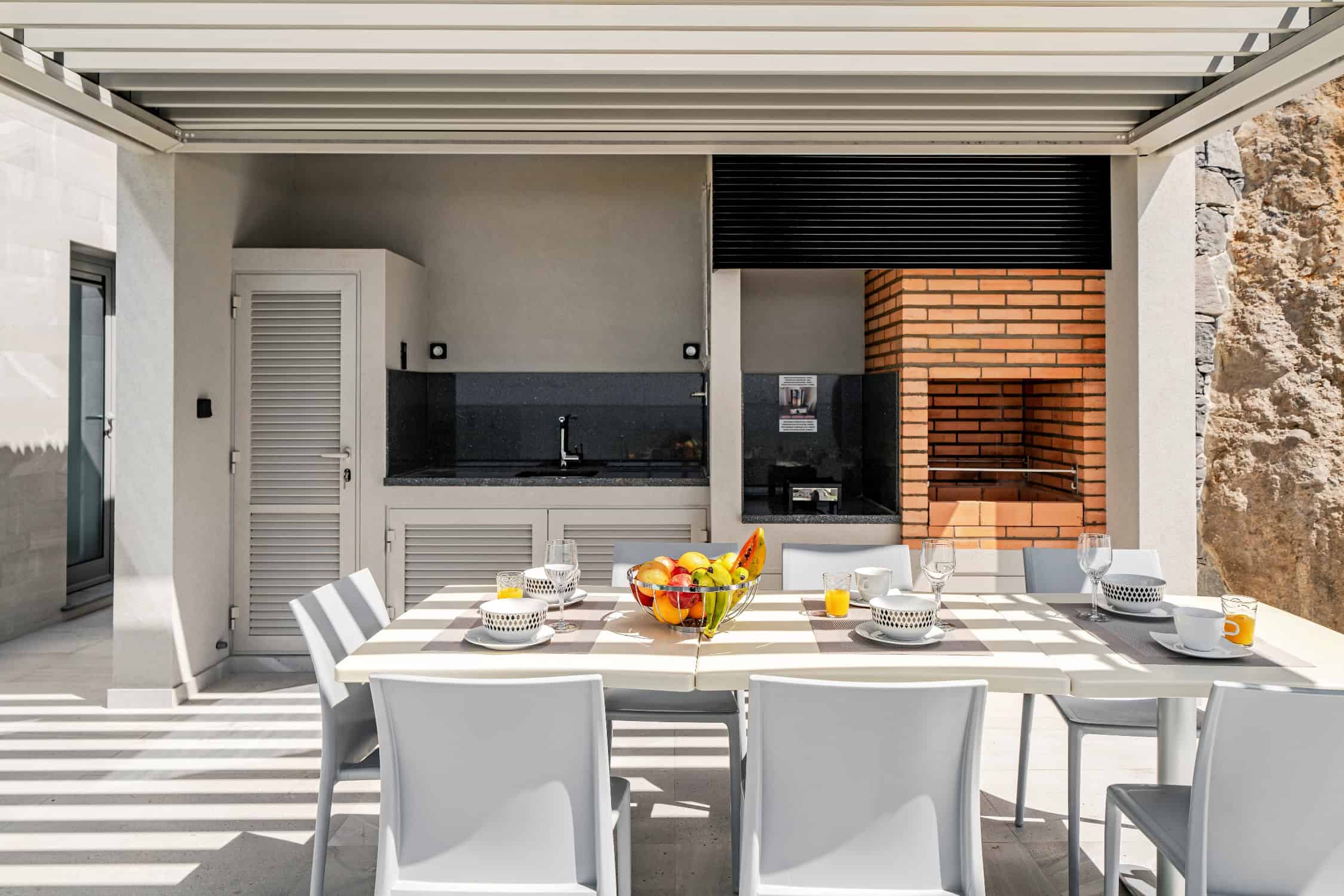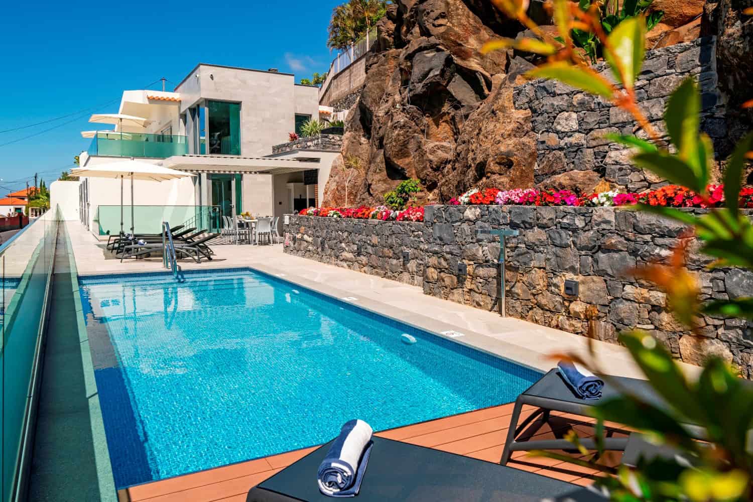 The villa’s typically-Madeiran – an open plan family-friendly living space, with a comfortable lounge/diner and a well-equipped modern kitchen. Floor-to-ceiling picture windows help blur the line between indoor and outdoor living – opening onto a large, south facing sun terrace with a private swimming pool and alfresco dining area. There are four bedrooms in total – two double rooms and two twin rooms: all ensuite and all fully air-conditioned. We recommend including a hire car during your stay and there’s private double garage on the ground floor.