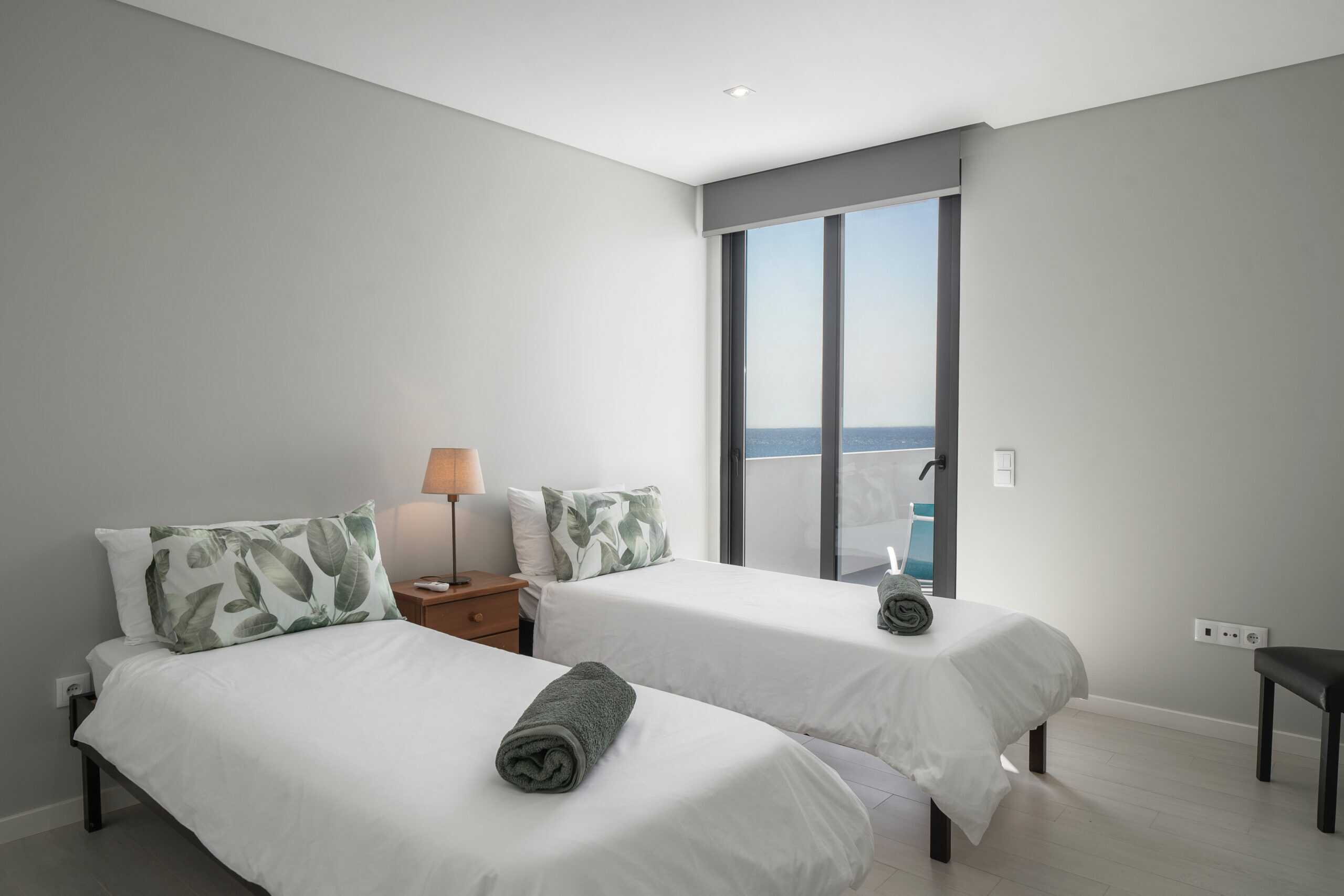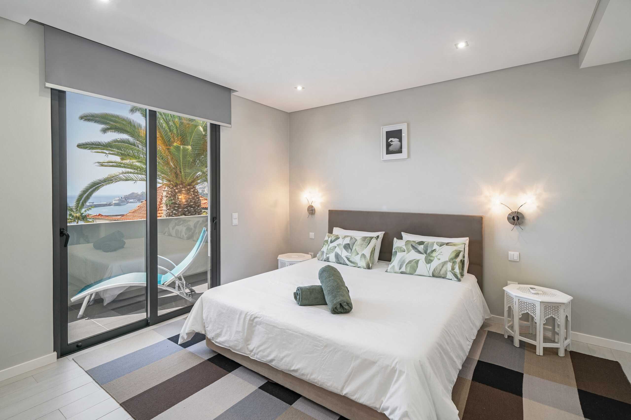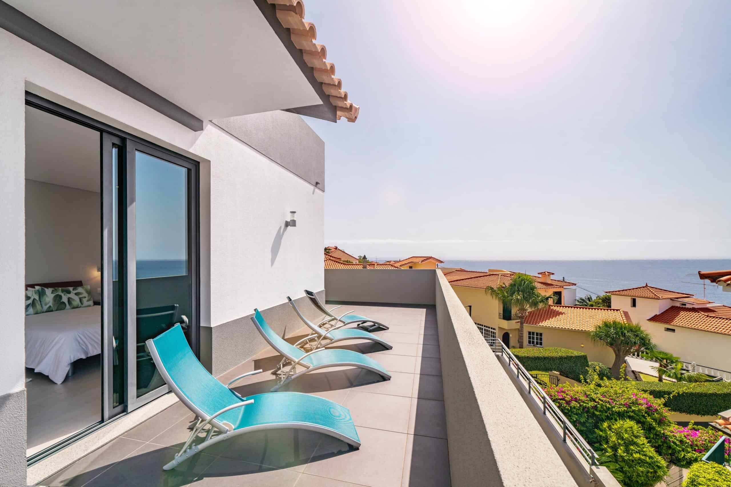 The heart of the villa is it’s sociable, open-plan ground floor living space which has a large lounge area, family dining table and a modern, well-equipped kitchen. Exits on both sides lead you out onto the first of two south-facing terraces, with a private pool, BBQ and al-fresco dining area. There are three ensuite bedrooms on the first floor, all opening onto a second sun terrace. The master and second bedrooms both have king-sized double beds, and bedroom number three is a twin. The sun terrace overlooks the terracotta rooftops of the Old Town, across the marina and out to sea – it’s a perfect suntrap in the summer and an even better private viewpoint for Funchal’s famous New Year’s firework display.
