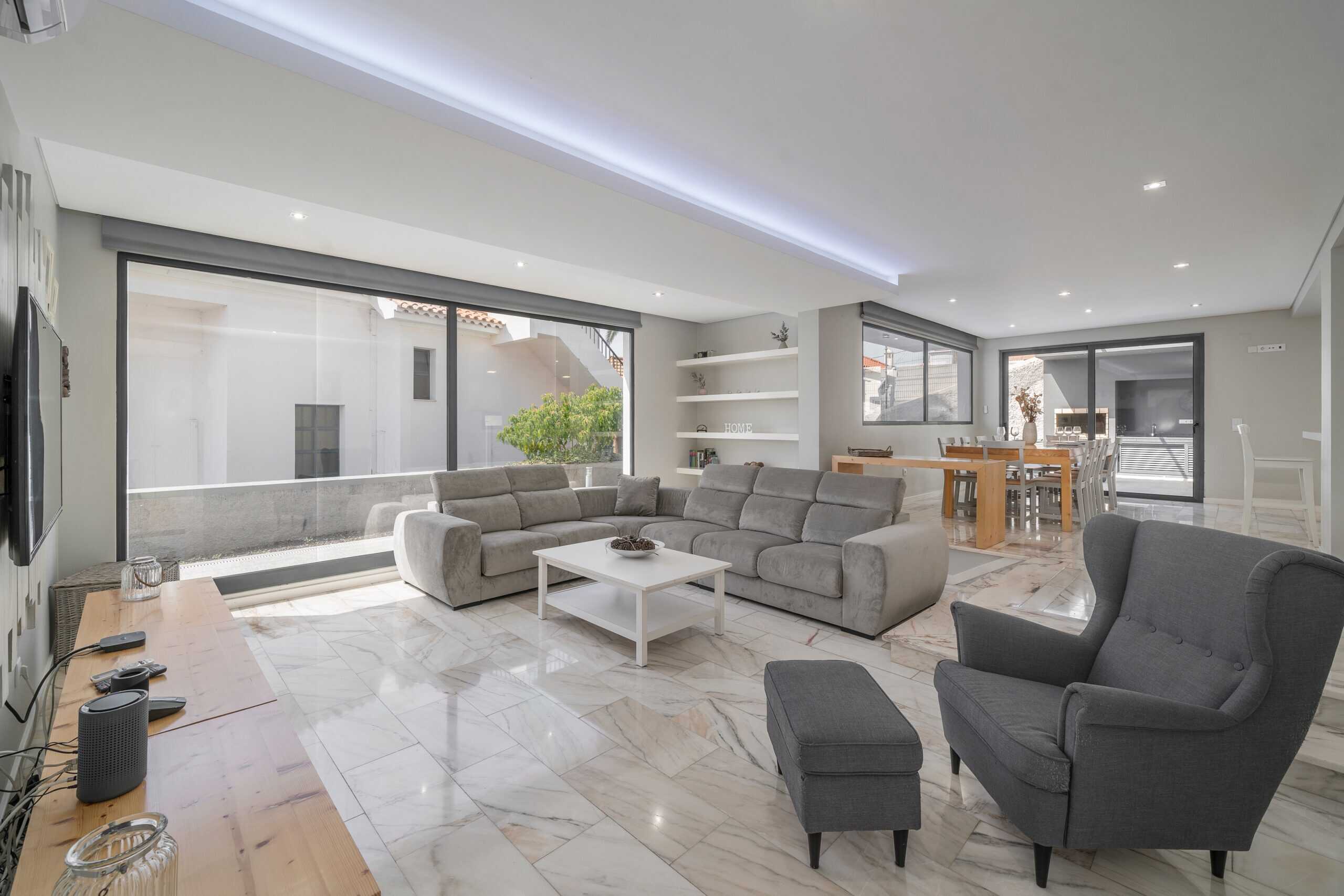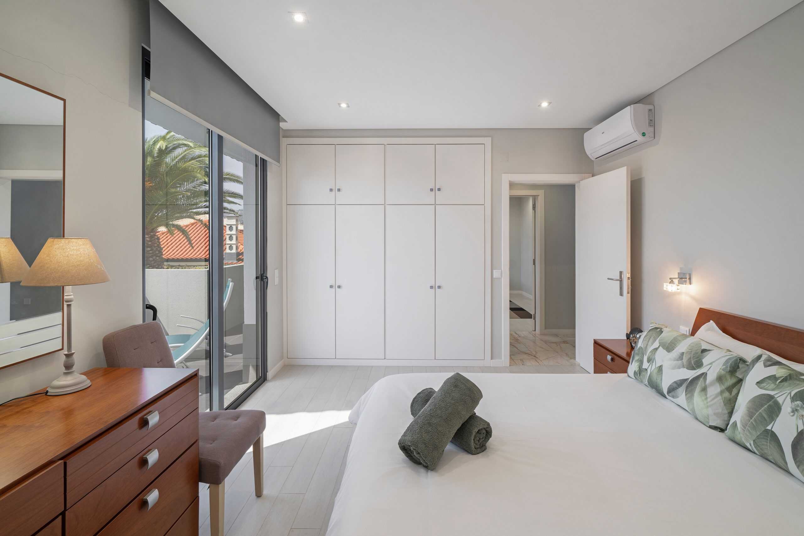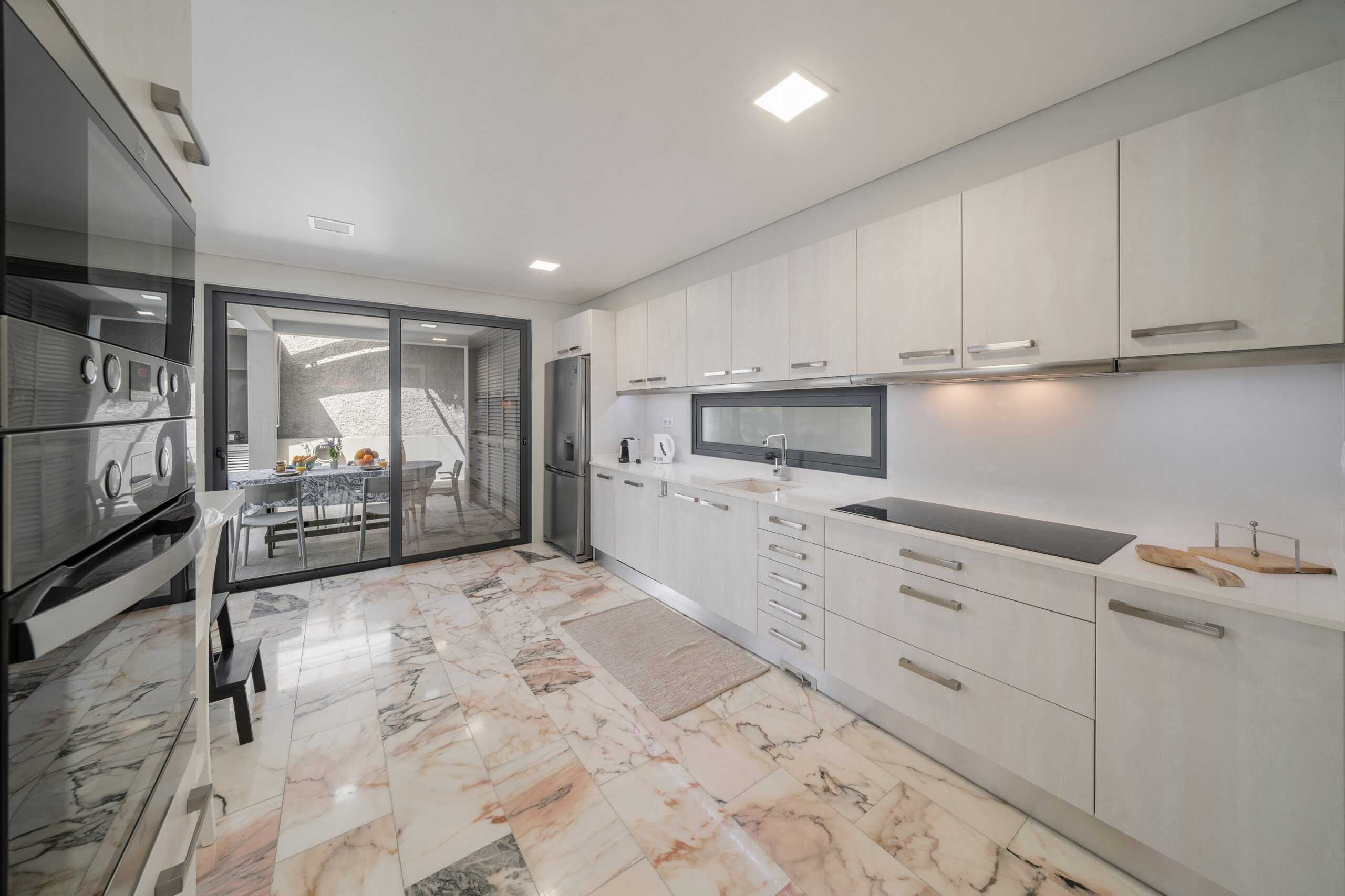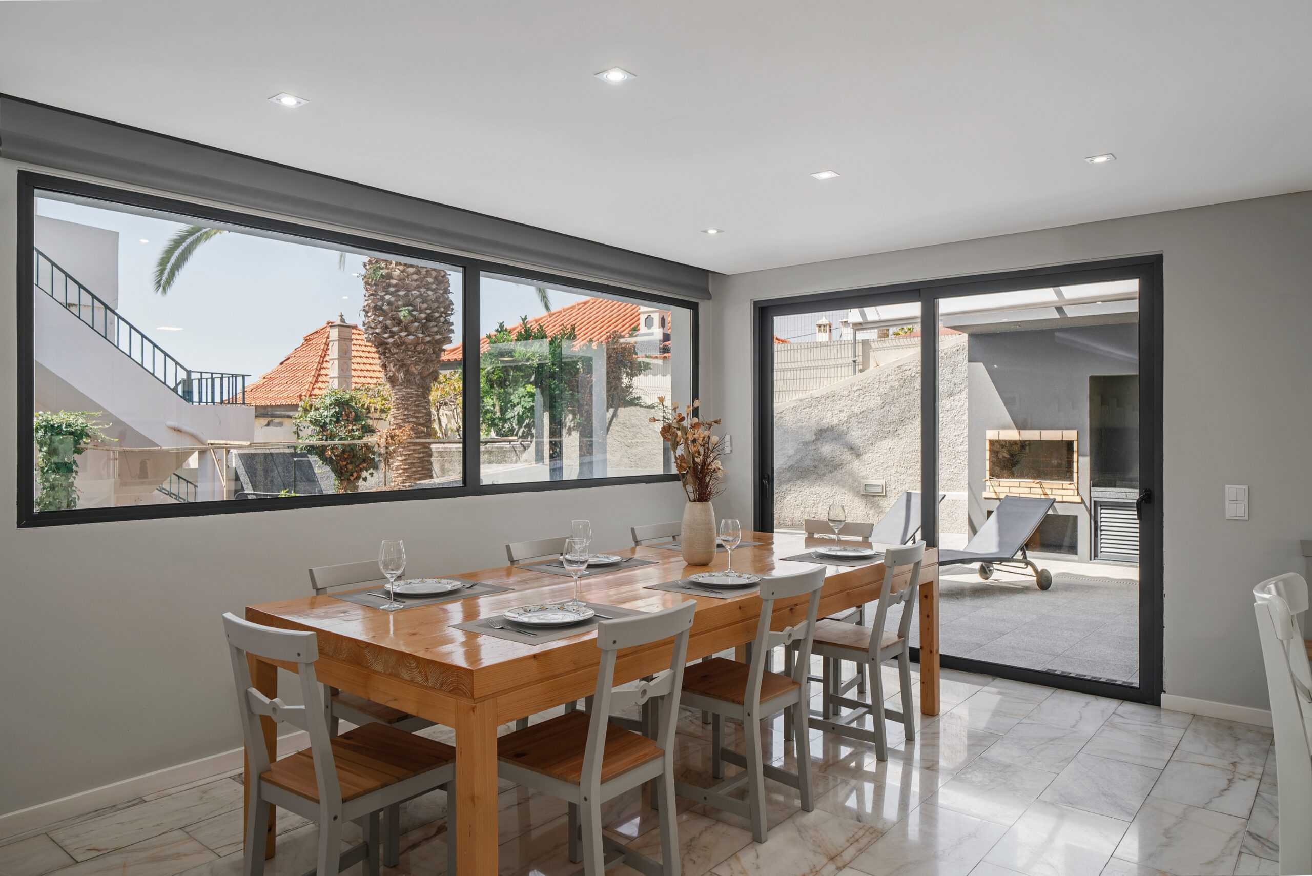 The heart of the villa is it’s sociable, open-plan ground floor living space which has a large lounge area, family dining table and a modern, well-equipped kitchen. Exits on both sides lead you out onto the first of two south-facing terraces, with a private pool, BBQ and al-fresco dining area. There are three ensuite bedrooms on the first floor, all opening onto a second sun terrace. The master and second bedrooms both have king-sized double beds, and bedroom number three is a twin. The sun terrace overlooks the terracotta rooftops of the Old Town, across the marina and out to sea – it’s a perfect suntrap in the summer and an even better private viewpoint for Funchal’s famous New Year’s firework display.