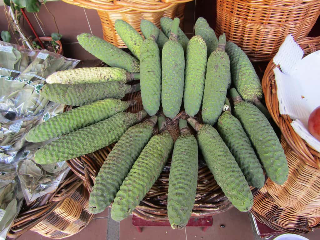 Less-familiar to many will be the annona – known here at home as a custard apple, which is a popular ingredient in Madeiran cheesecakes and ice creams (and often eaten as a desert in it’s own right). The monstera deliciosa, or swiss cheese fruit, looks like an elongated cousin of the annona but they’re not related. Swiss cheese fruit has a surprising flavour – somewhere between a banana and a pineapple. There’s also the small uveira da serra, which is endemic to Madeira and grows wild on the island’s high plains – where there’s laurisilva, you’ll usually find uveira. Being a member of the blueberry family, uveiras are not unlike bilberries here in the UK.