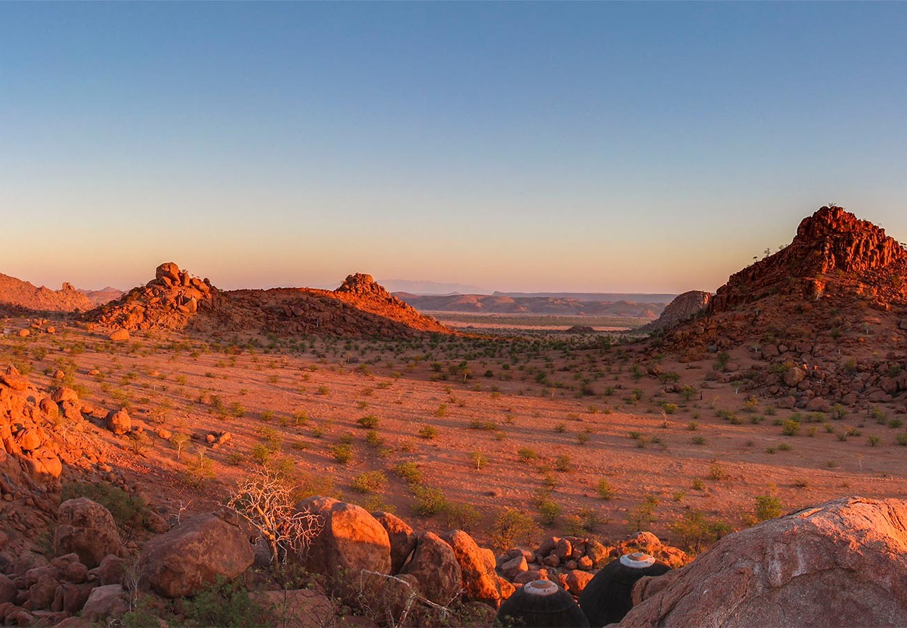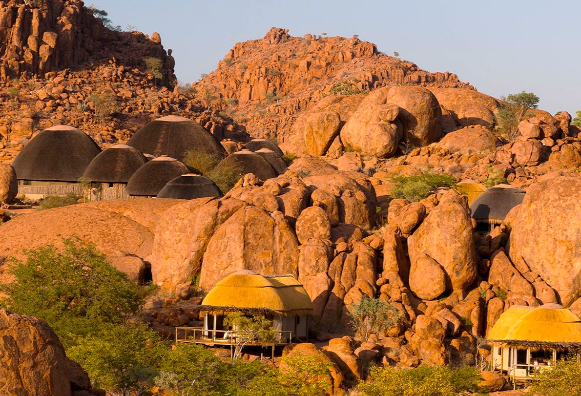 The rustic huts have comfortable beds, and there’s a shared pool out in the open, which is very much like a natural rock pool. This place really does have the feeling of being a simple, tranquil retreat, set in the most beautiful surroundings. There’s a comfortable lounge area with a little bar to buy cocktails, and you can enjoy panoramic views of the savanna whilst you dine on the deck. You can enjoy guided game drives to see desert-adapted animals, including a large elephant population, black rhino, antelope, jackals, and much more. You are also very close to the Damara Living Museum, where you can enjoy an immersive insight into how to San people (bushmen) once lived.