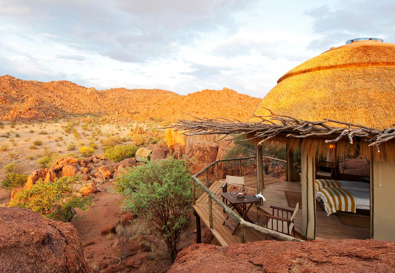 The Mowani Mountain Camp is a beautiful place to stay and a great choice for those who want an authentic African experience. Its in the Twyfelfontain Conservancy, in the Damaraland Region of Namibia, which is best known for a large elephant population. This is a beautiful collection of thatched huts, all the necessary comforts to add a touch of luxury. The rooms are nestled amongst the soft granite boulders, think the flintstones! There are shared outdoor seating around around a fire pit open fires that looks across a flat landscape dotted with pointed granite rock formations (called kopjes).