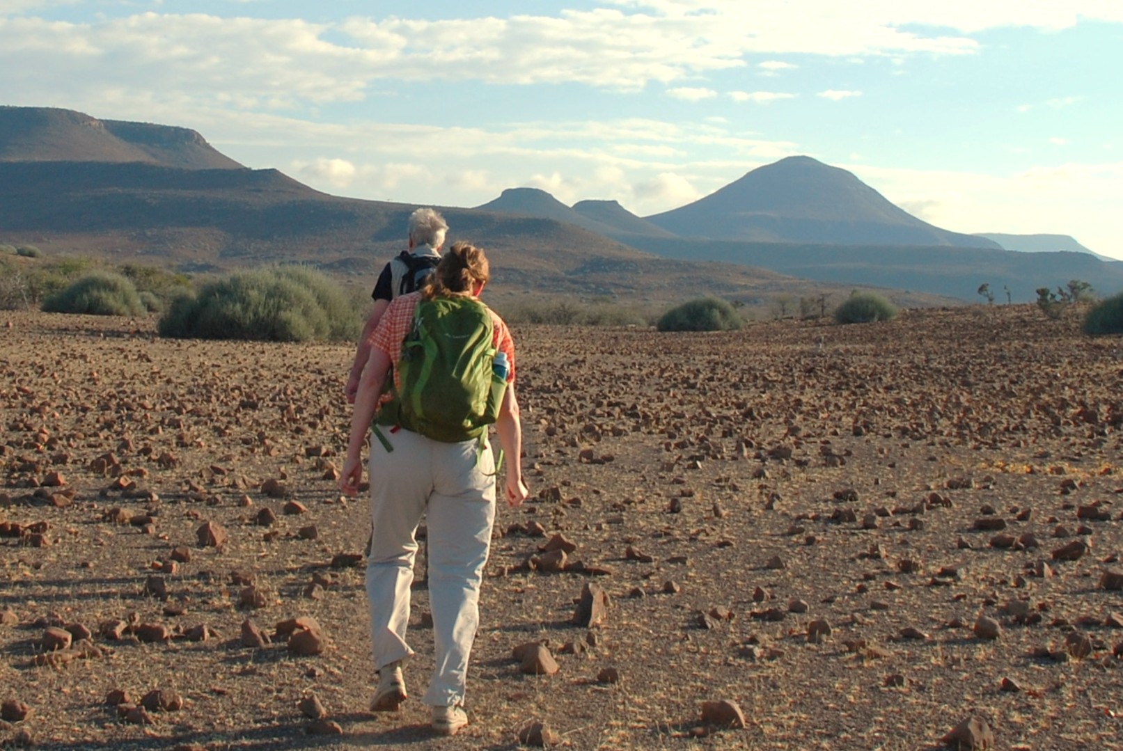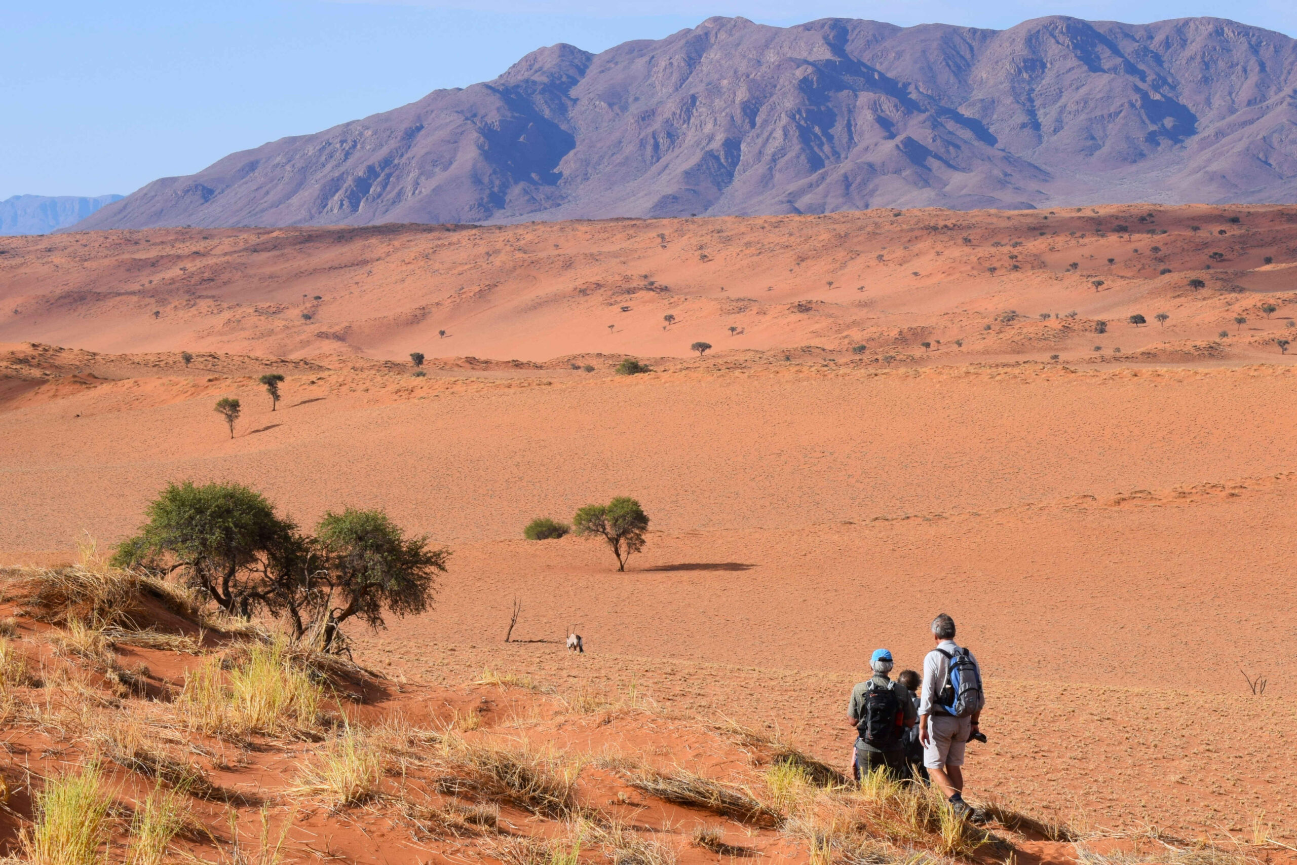 This is an adventurous holiday that includes seven days of hiking, camping beneath the stars in fixed desert camps. Your guide will help you look for animal tracks and droppings and will tell you about the plants and geology of the area. At camp, you get to enjoy delicious meals prepared by your wonderful camp-crew. Your mini hiking-expeditions take you through the intense red sands of the Kalahari desert, the red dunes and rocky mountains of the NamibRand, and the basalt plains of Etendeke.