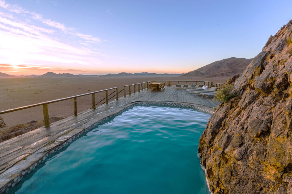 At the Elegant Desert Eco Camp, you are far out in the Namib Desert, with nothing but the flat desert floor and the distant mountains as far as the eye can see. This tented camp is more rustic than some of the luxury lodges, but would still be considered ‘glamping’, with comfortable beds, showers, and an incredible mountain-top pool. Enjoy the desert calm and visit the nearby giant dunes of Sossusvlei, the scorched trees in the Deadvlei clay pan, and Sisriem Canyon.