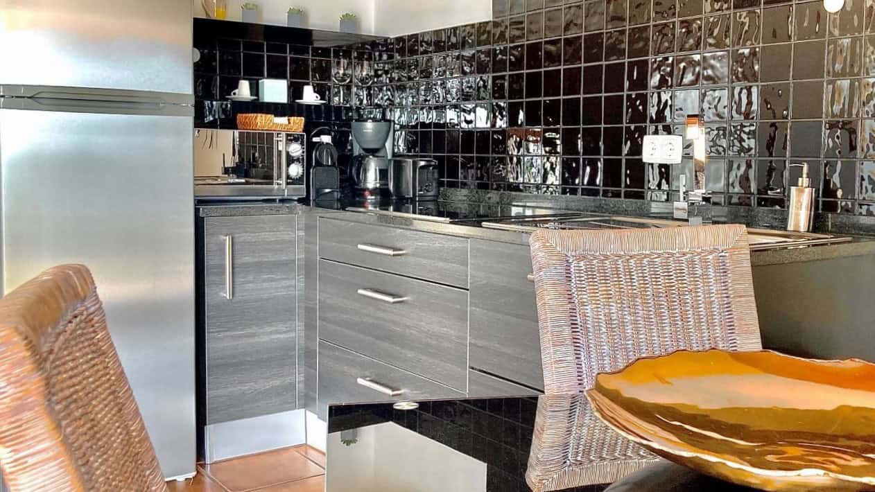 Each villa consists of a cosy living room, a small open-plan kitchenette-diner and an ensuite double bedroom on the ground floor, and a large mezzanine upstairs. There are also two private sun terraces – one facing northwest and a larger one to the southwest, overlooking the gardens and outdoor pool.