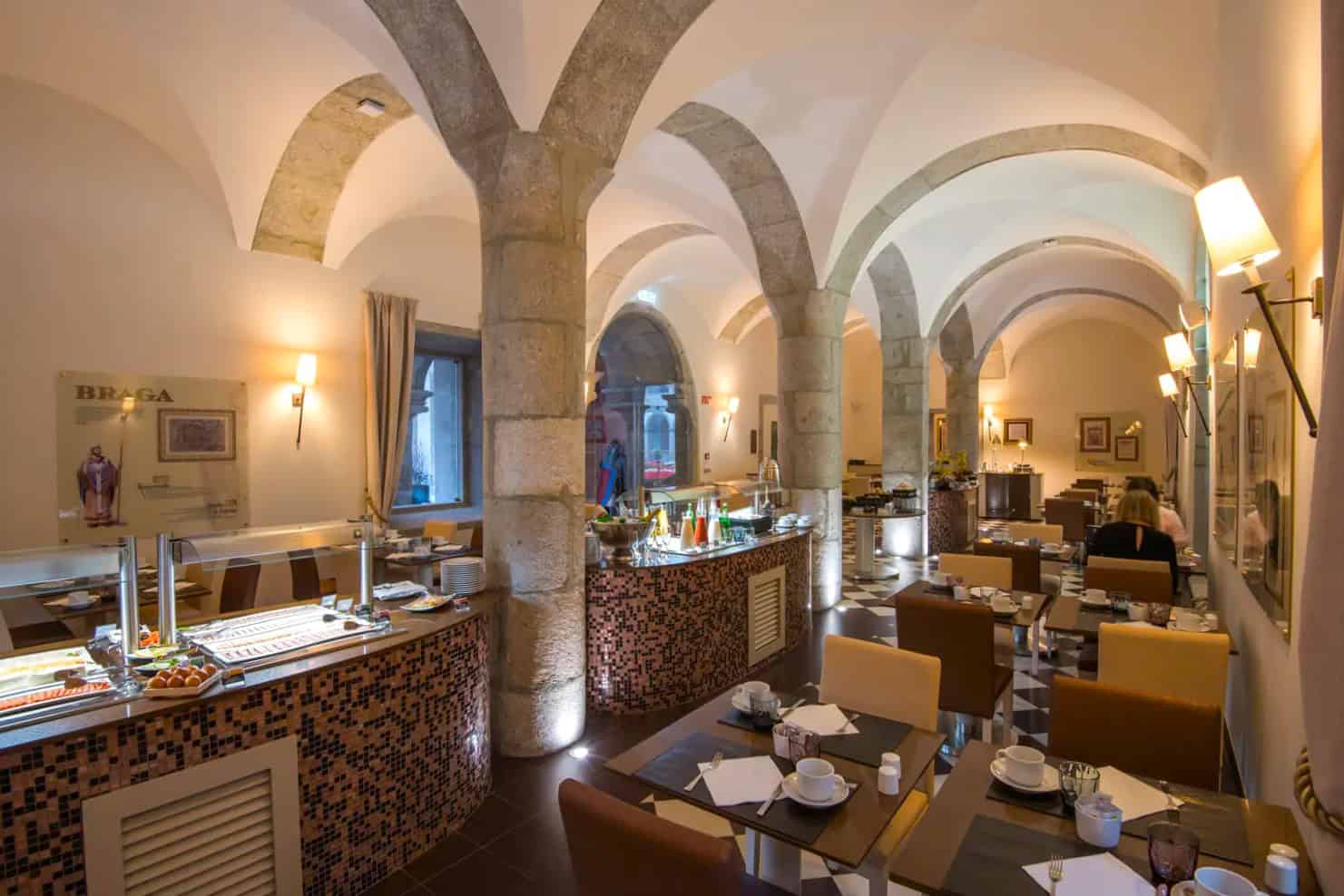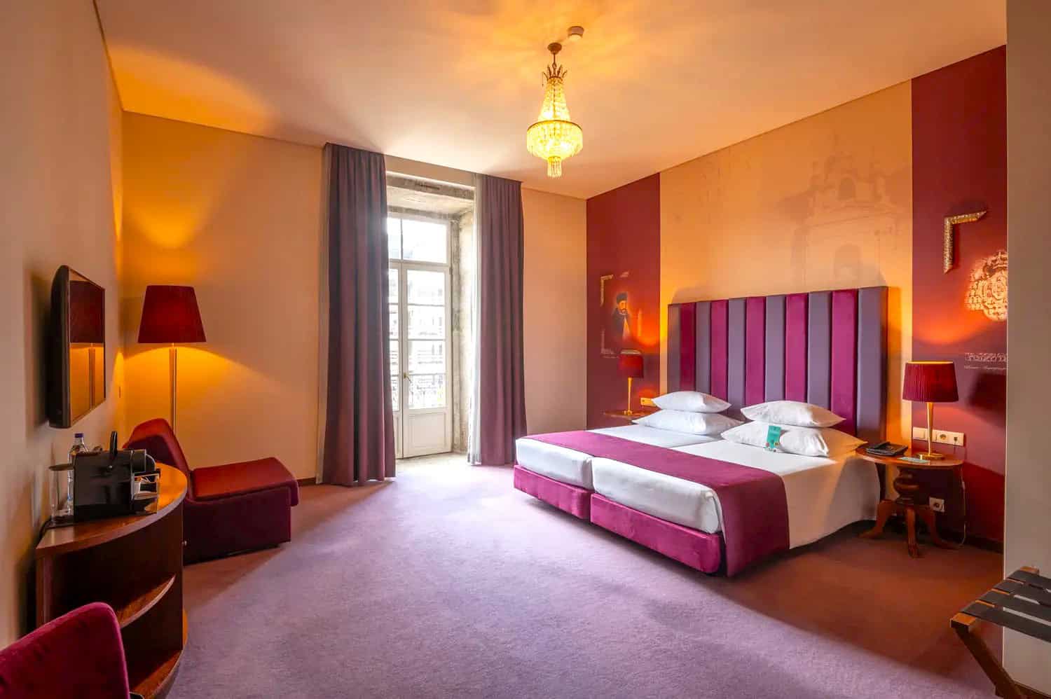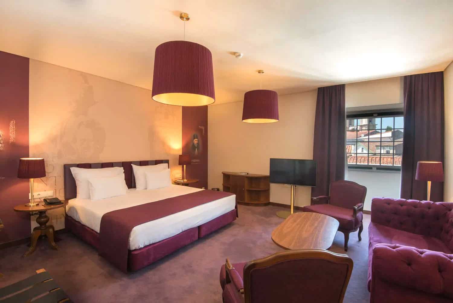The most impressive, original architectural features can be seen in the shared guest areas: the gable archway in the entrance lobby, the vaulted ceilings in the hotel’s Versatil and Inevitavel restaurants, and the inner cloister with its baroque fountain. The 123 guest rooms are more contemporary in their feel, with a palette of gentle shades and simple, uncluttered furnishing. There are 22 family rooms, 7 superior rooms and 15 suites – some have balconies overlooking a small inner garden, others overlook the sun terrace and outdoor pool – there’s also an indoor pool and well-equipped gym.