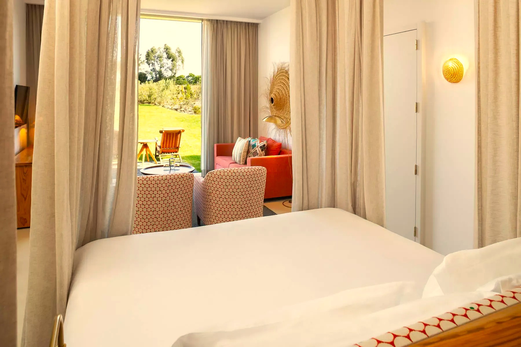 Indoors, the contemporary architecture is softened by natural, soft furnishings which give the guest rooms a comfortable, homely feel. Rooms are groups one-up/one-down, with balcony rooms on the first floor, and garden terrace rooms on the ground.  In both cases, west facing patio doors blur the divide between inside and out.