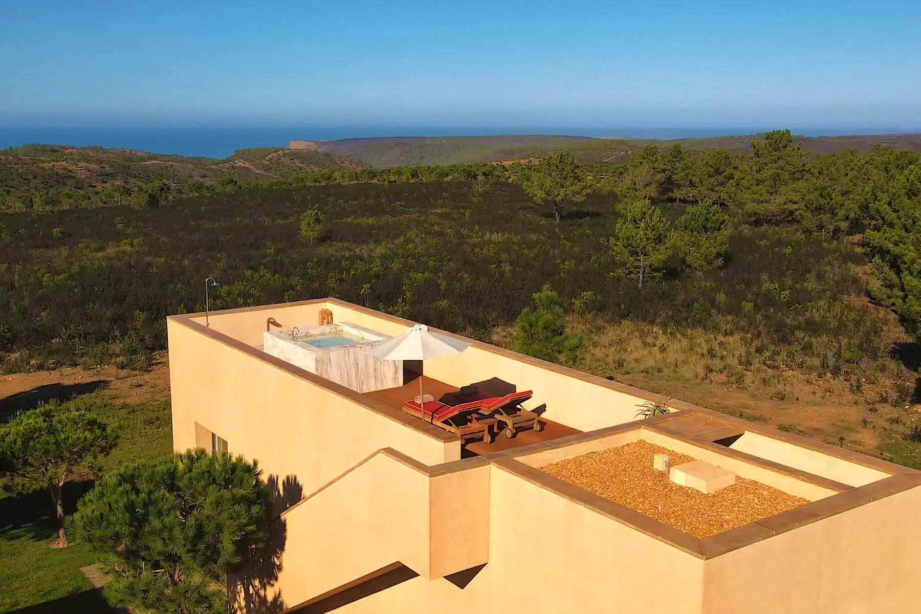 This is a hotel which often doesn’t feel like a hotel – it has the aura of laid back, hidden community. It’s almost brutalist architecture somehow sits lightly against the surrounding pine and aloe woodlands: earthy tones and minimalist lines which gently harmonise with the protected landscape of the Parque Natural do Sudoeste Alentejano e Costa Vicentina.