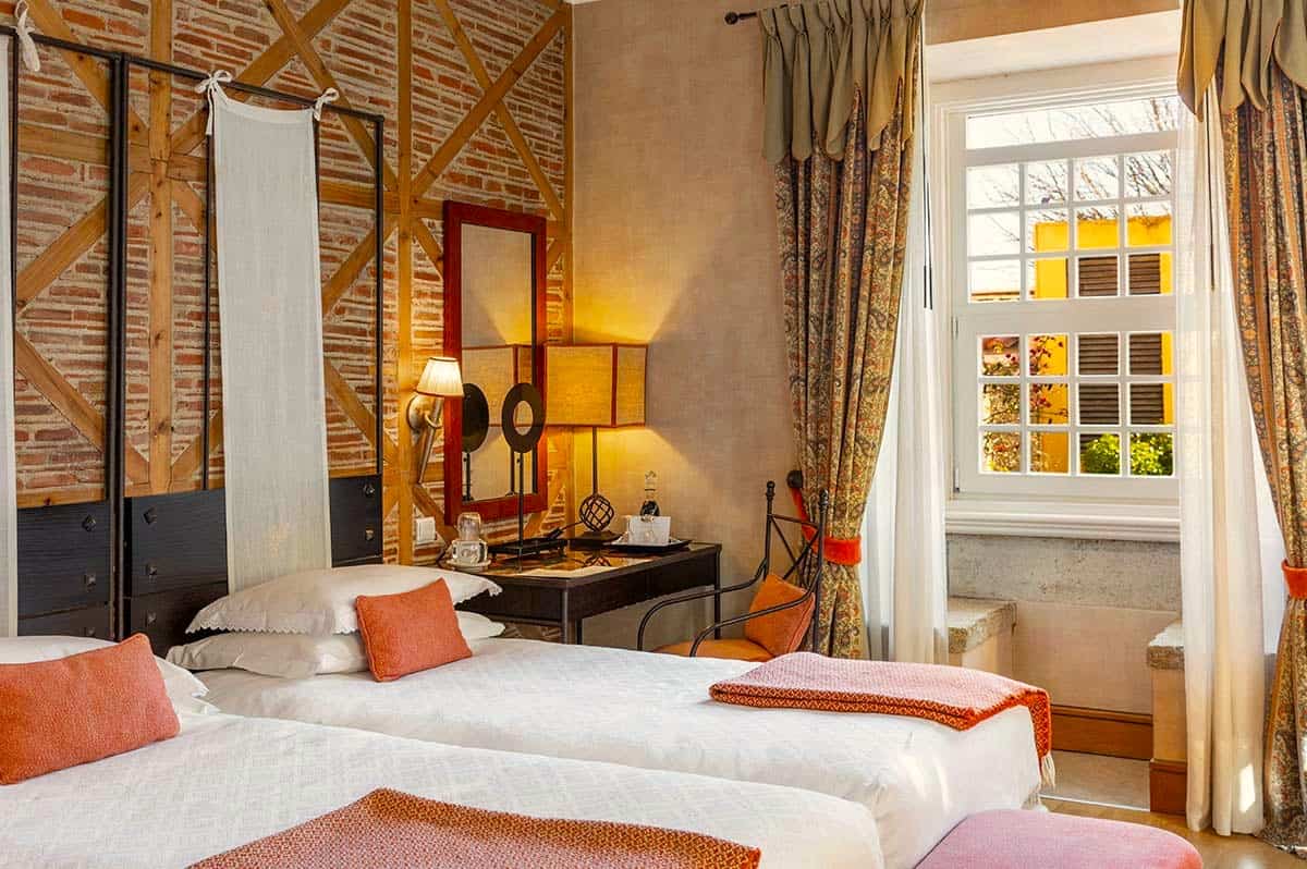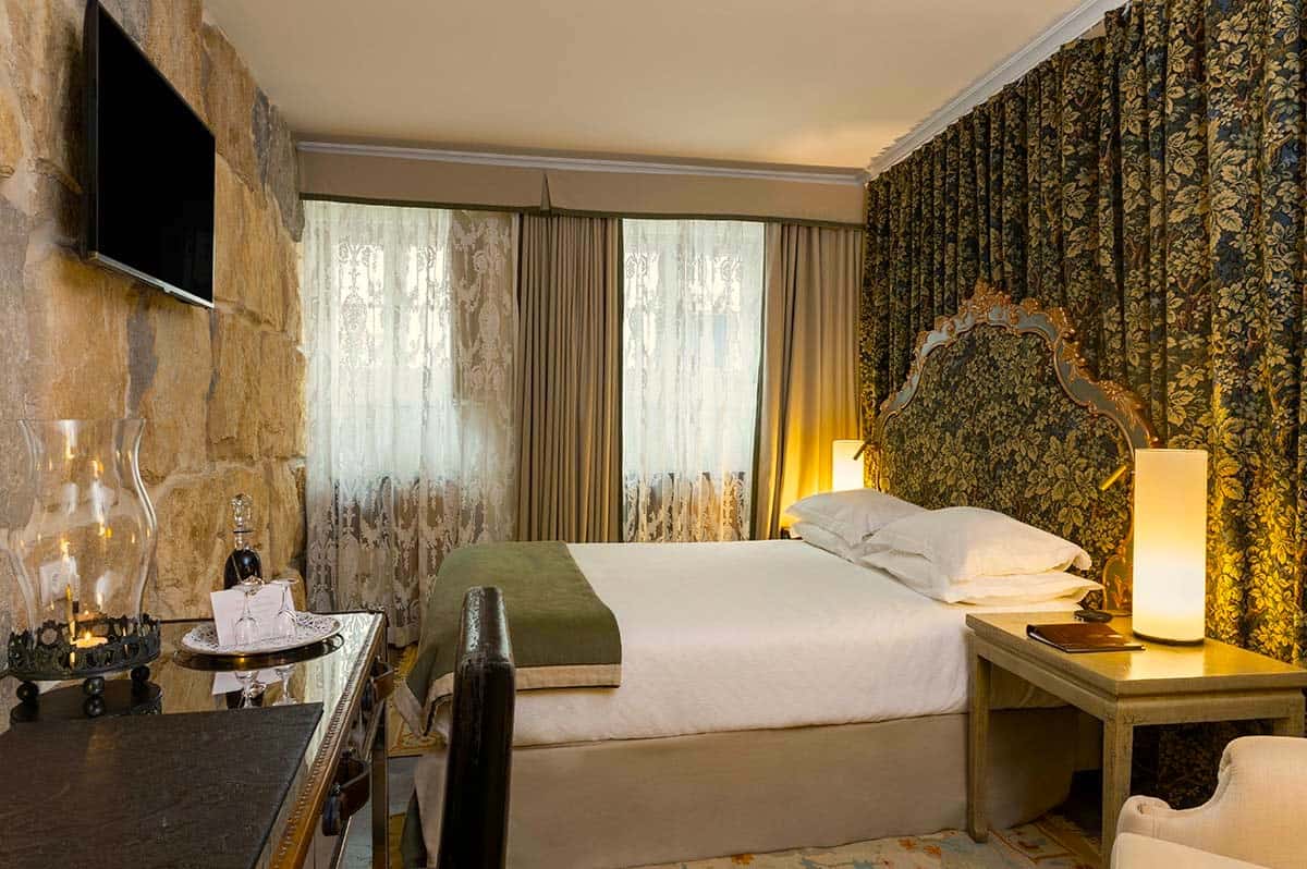 Our drivers can take you close to, but not quite up to the hotel’s front door – pedestrian-only access is part of the hotel’s quiet charm. The hotel staff will take you the last three hundred metres, along the cobbled medieval street to where a small sign hangs above an unassuming blue door. Heading inside, you’ll enter a beautifully restored grand hallway of decorative archways and exposed, roughly hewn stone. Medieval design is carefullly balanced with contemporary comfort, from the bespoke furniture in the shared lounges to the heavy linens, oak floors and decorative ceilings in the twenty guest bedrooms.