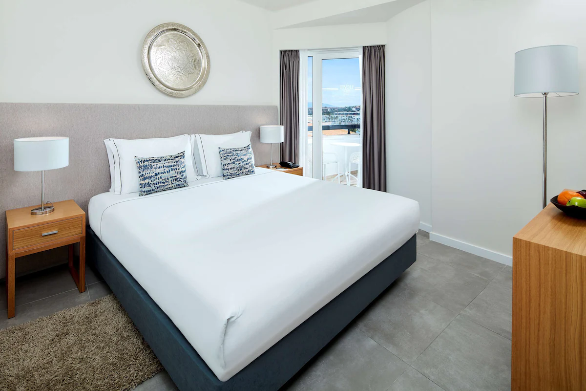 Walkways of white and blue run throughout the hotel – connecting the restaurant and Amora bar with the peaceful courtyard garden, and indoor and outdoor pools with the guest rooms. Standard rooms are the most secluded, with balconies overlooking central Lagos. Superior and Superior XL rooms are larger, with balconies overlooking either Lagos, the garden, or the outdoor pool. For families, there are Deluxe and Pool View Deluxe rooms, and the most spacious rooms of all are the Suites.