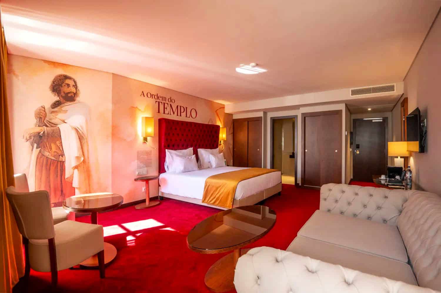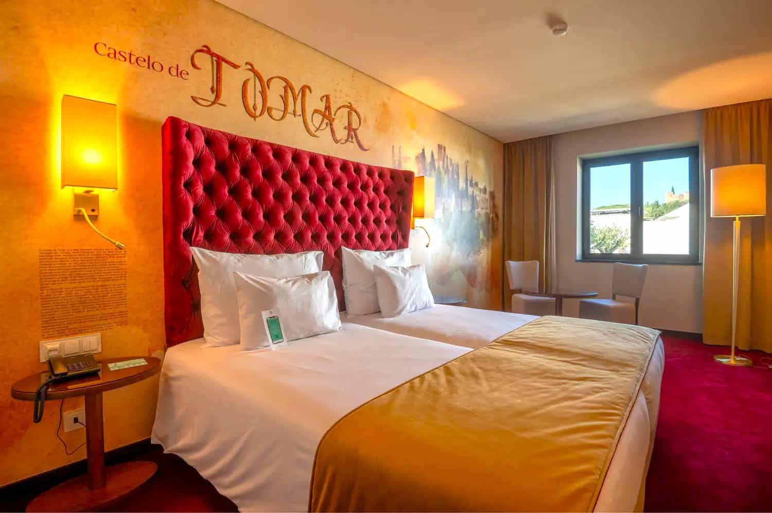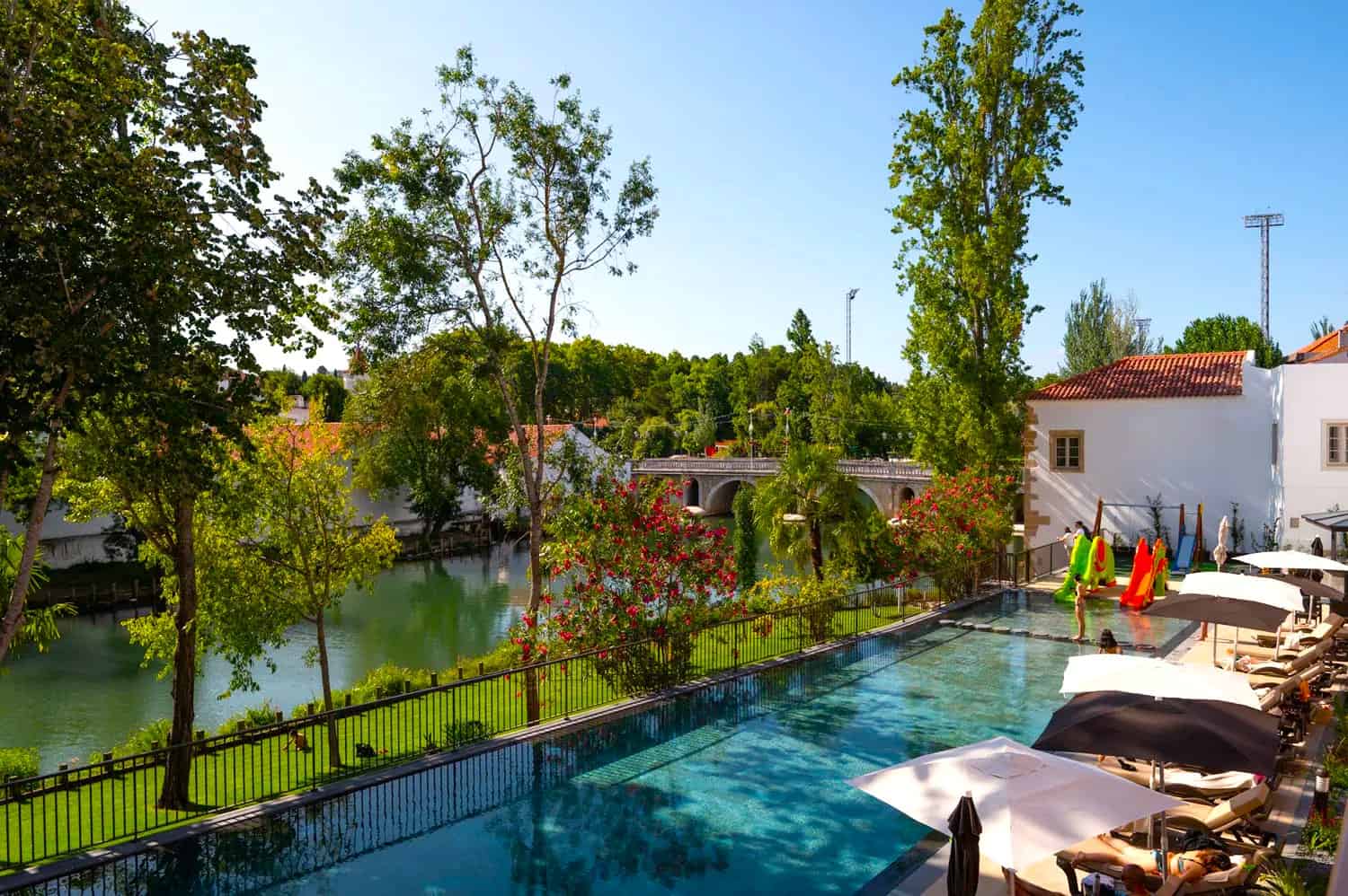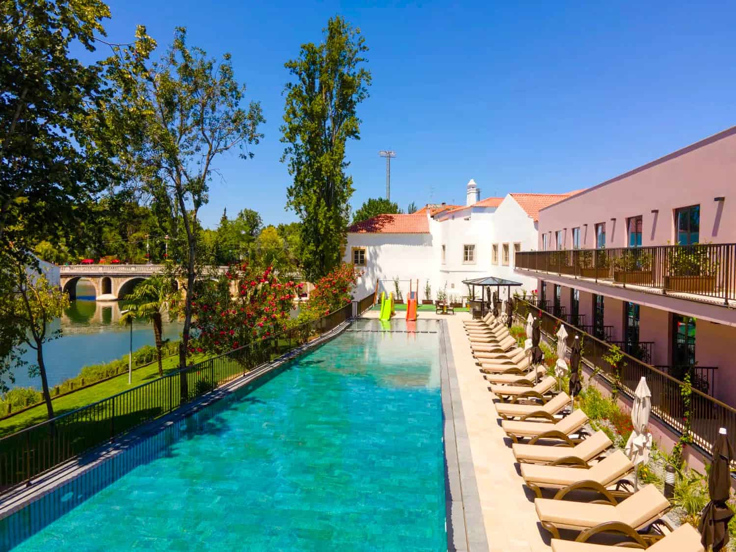 By contrast, the newly constructed riverfront wing sits on the footprint of an old factory. Away from its more well-known Knights Templar associations, Tomar was once an industrial centre and the fast-flowing river provided power to the paper mills, foundries and glassworks which once lined the eastern bank. There are 100 air-conditioned ensuite rooms in total – Vile Gale often adopt a local historic theme for their hotels, and here the obvious choice is the Order of the Knights Templar. River view rooms are our recommended choice, with balconies overlooking the outdoor pool – which in turn overlooks the Rio Nabao and the Ponta Velha. There’s also heated indoor pool, a spa and wellness centre, a games room and a library.